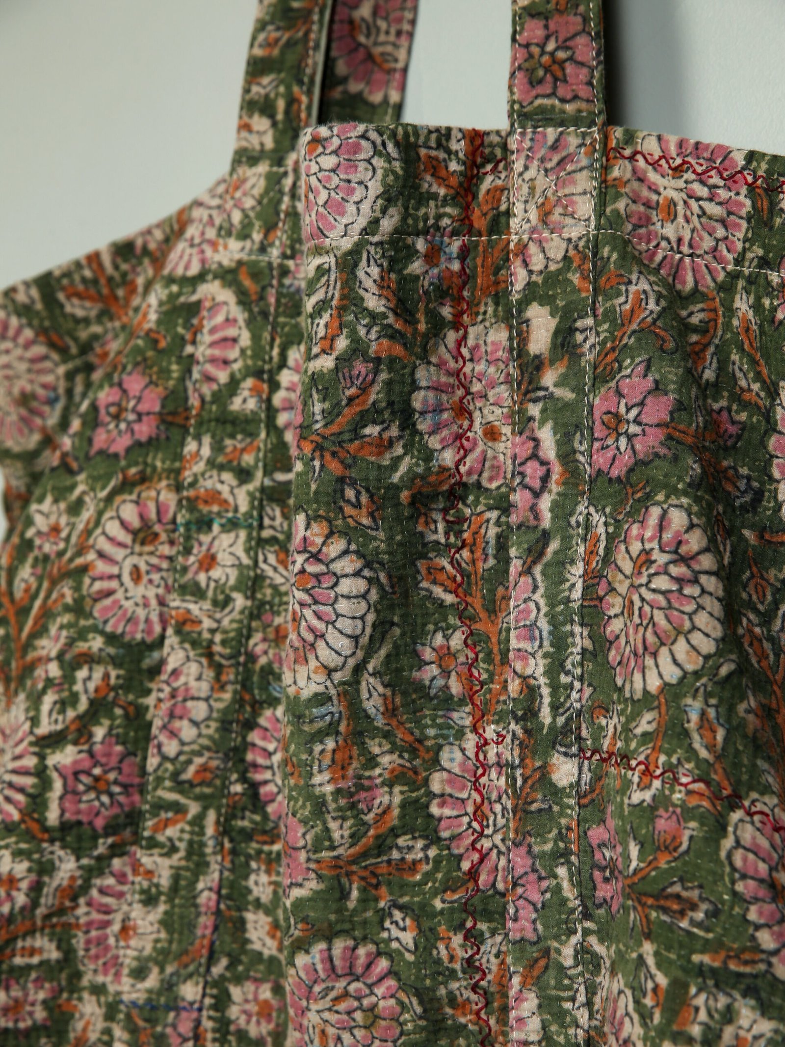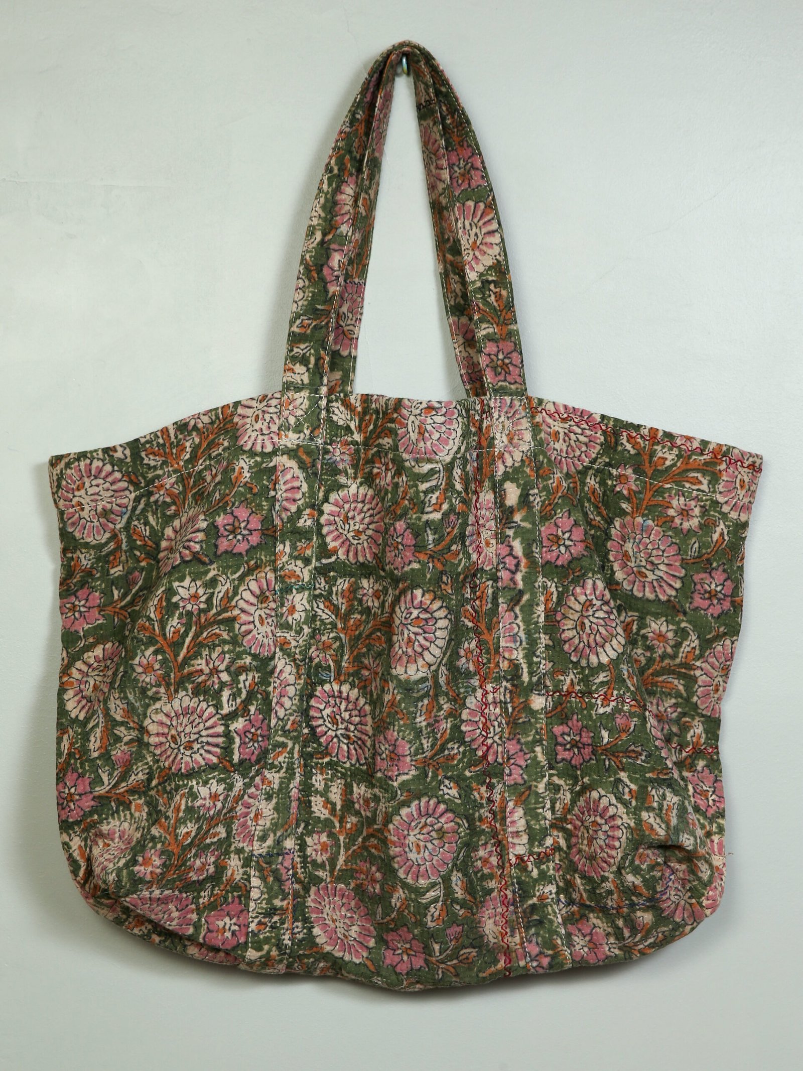 Ce cabas a été créé à partir d’un tissu ancien appelé kantha qui porte les empreintes du temps et des mains qui l’ont façonné. De fait il peut présenter des irrégularités qui en font l’âme et la beauté.