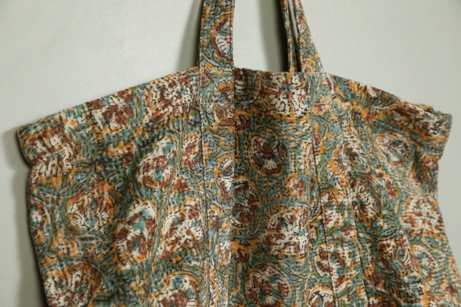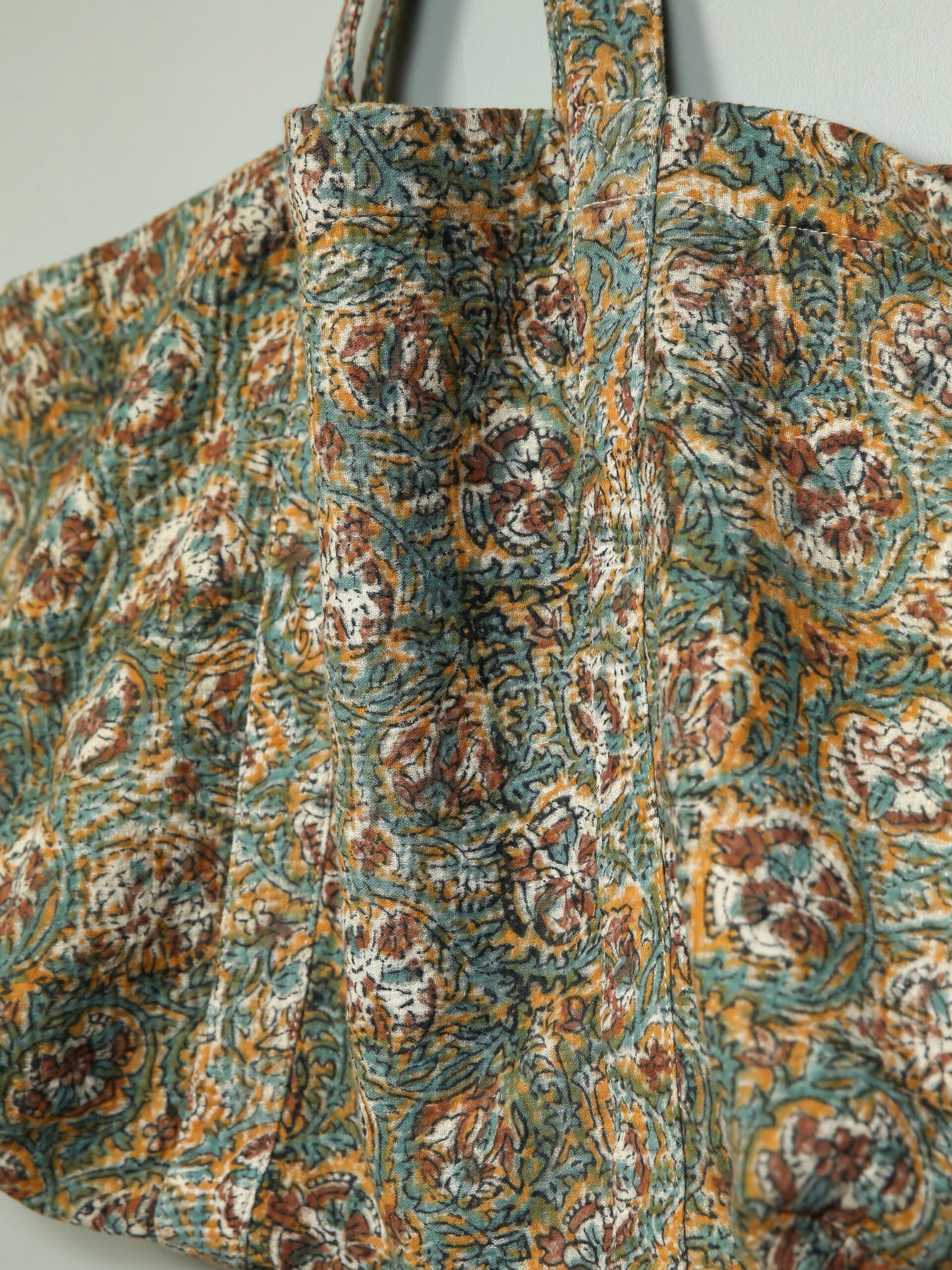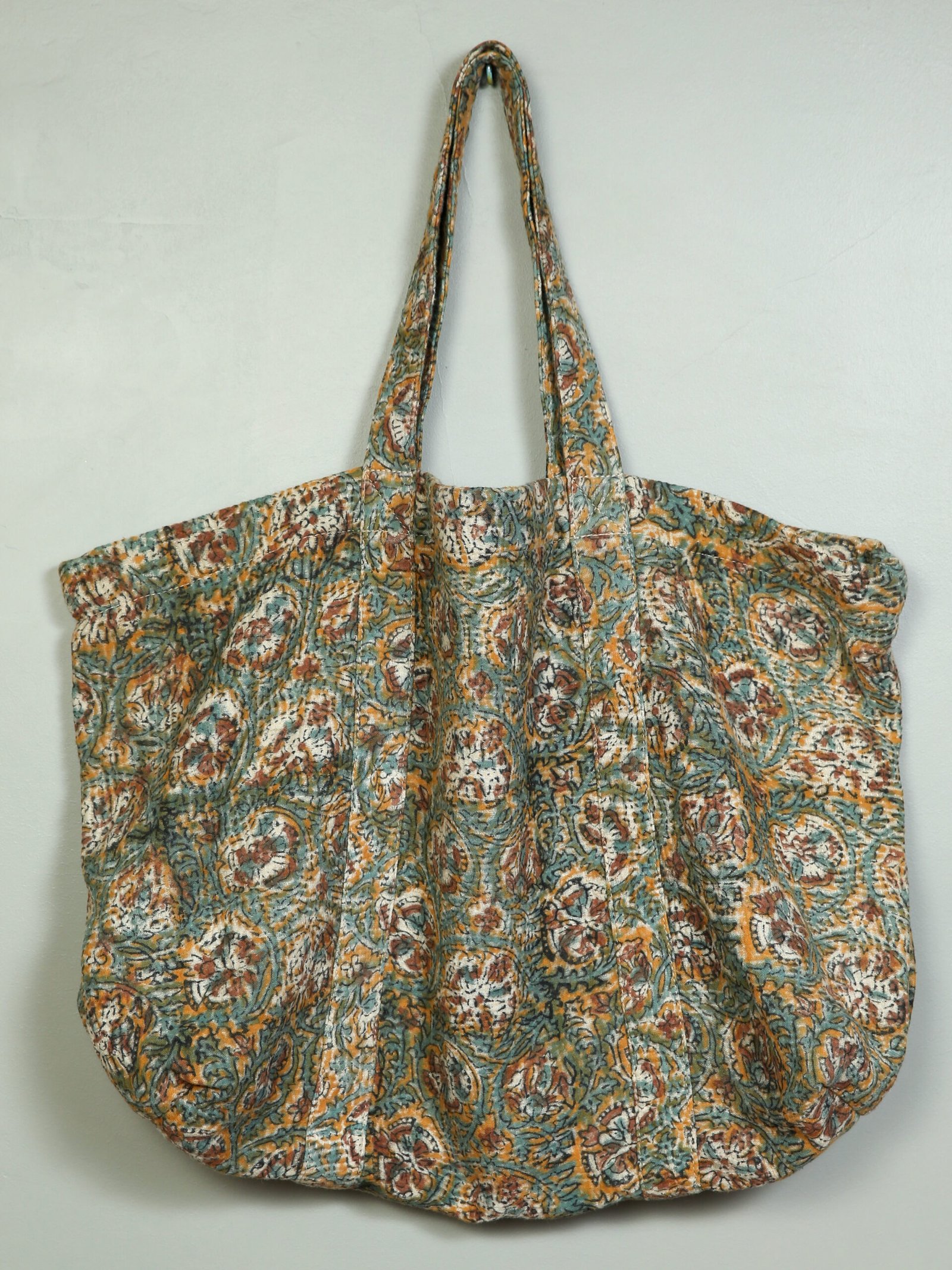 Ce cabas a été créé à partir d’un tissu ancien appelé kantha qui porte les empreintes du temps et des mains qui l’ont façonné. De fait il peut présenter des irrégularités qui en font l’âme et la beauté.