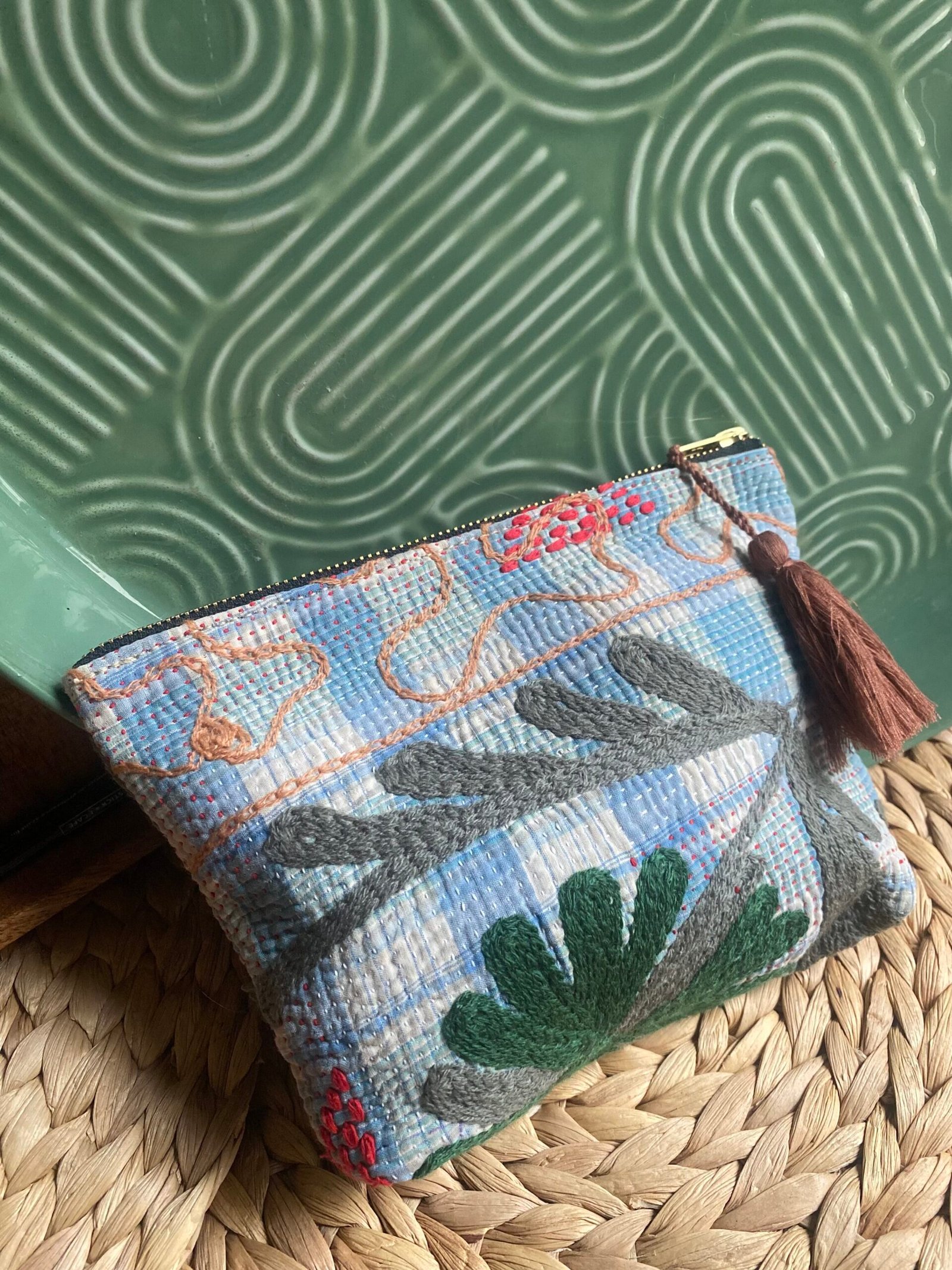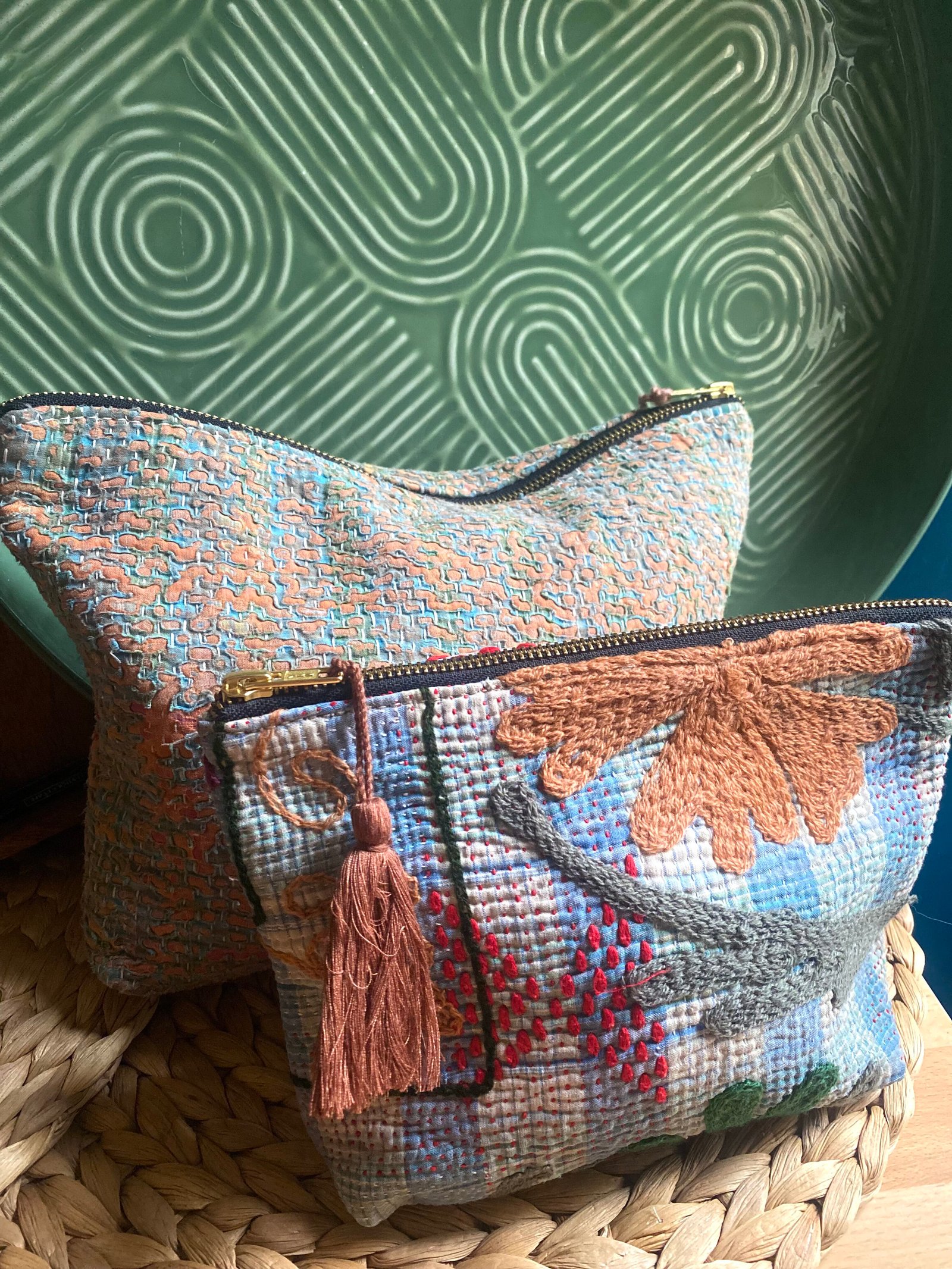 Cette trousse a été créée à partir d’un tissu ancien appelé kantha qui porte les empreintes du temps et des mains qui l’ont façonné. De fait elle peut présenter des irrégularités qui en font l’âme et la beauté.