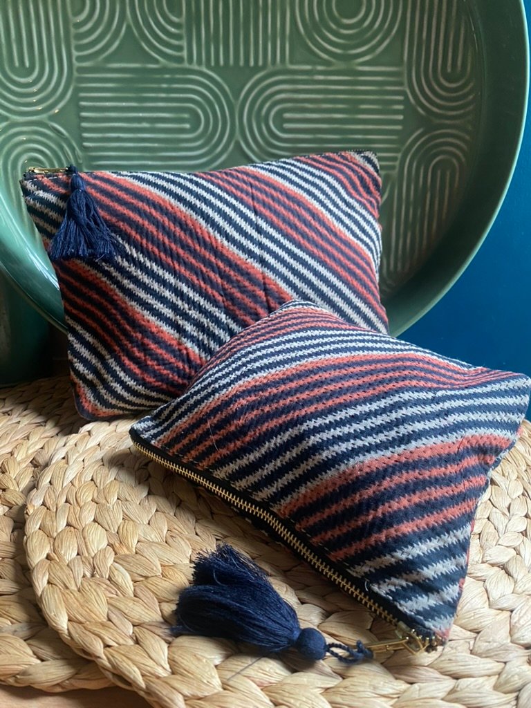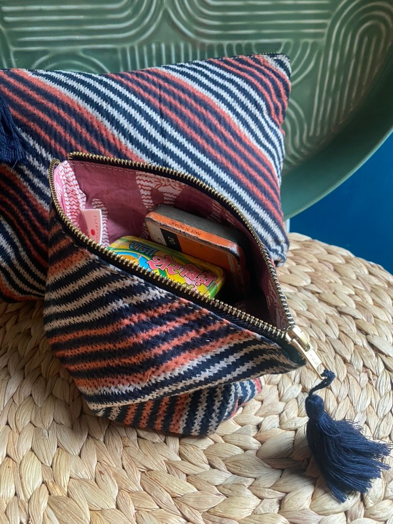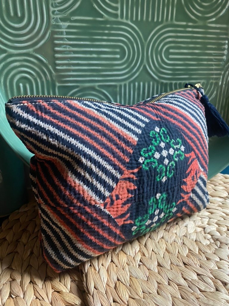 Ce set de trousses réalisé à partir des chutes des kanthas qui servent à la confection des vestes de la collection, vous rappelle que le monde est beau ! Fond plat très pratique. Doublure en coton imprimé. Pièce unique.
