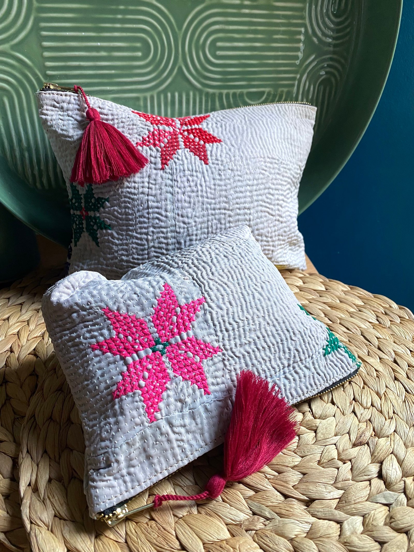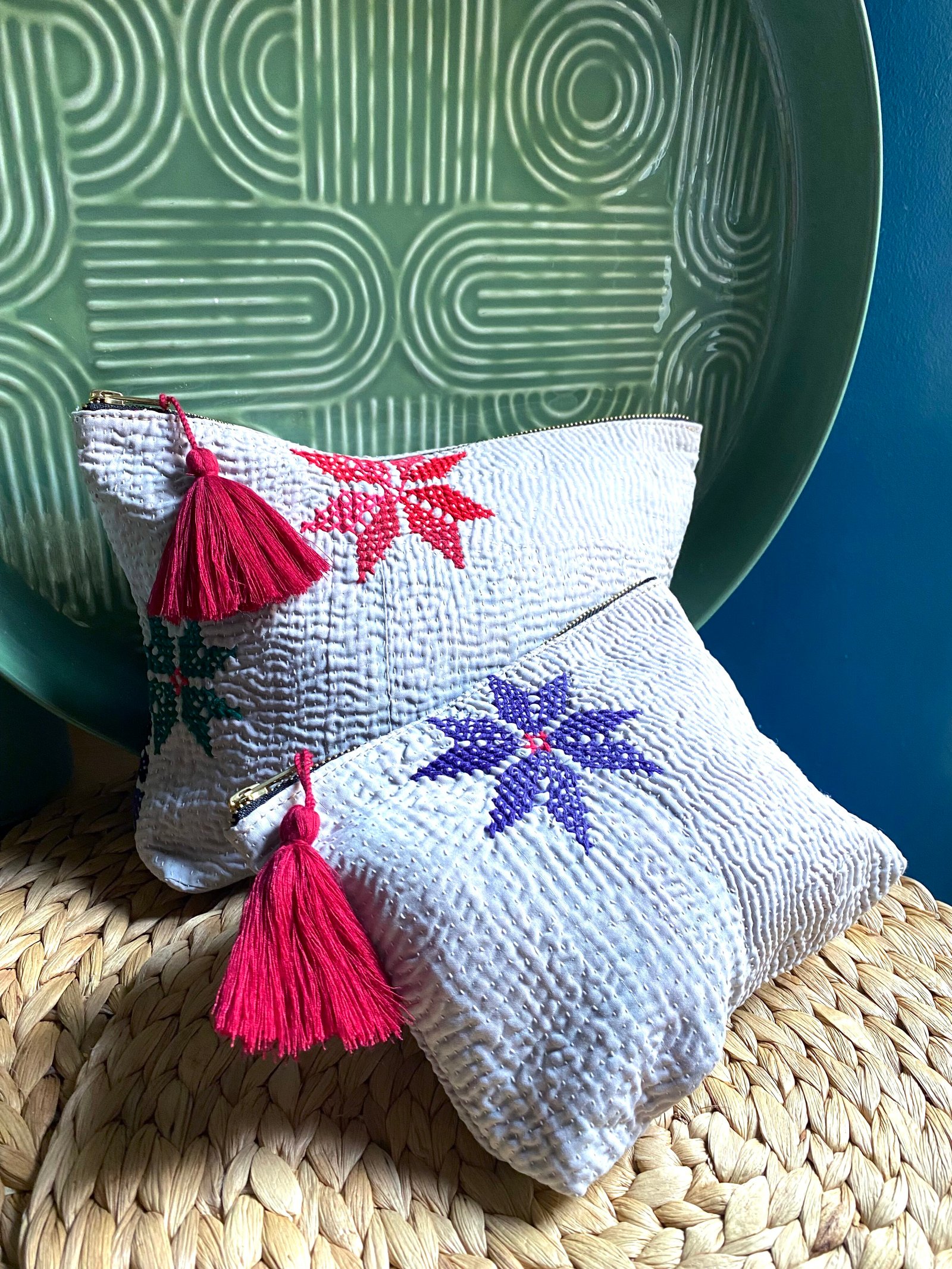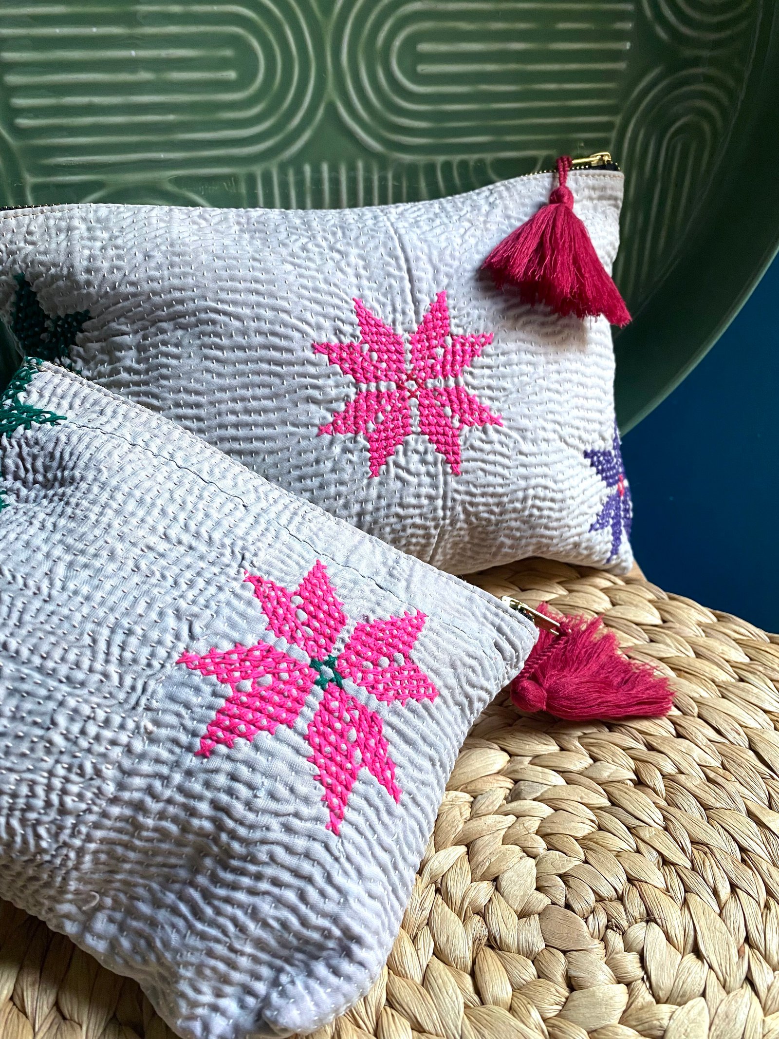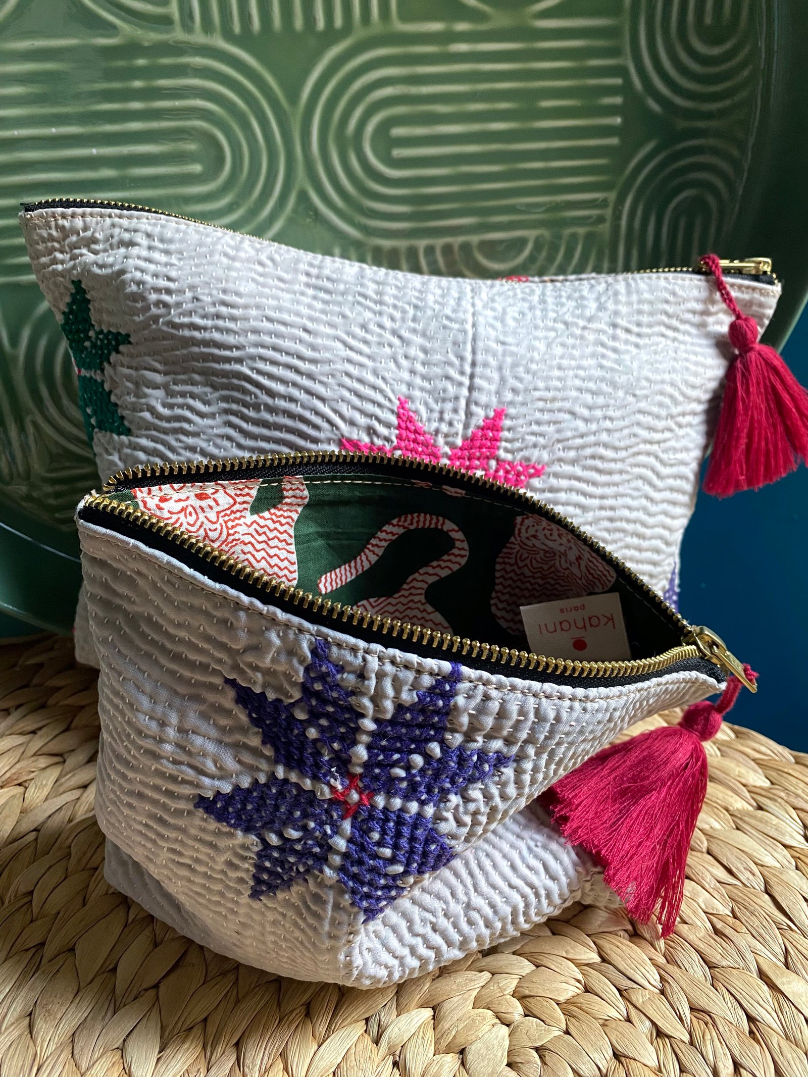 Ces pièces sont confectionnées à partir d’un kantha ancien. Elles peuvent présenter de légères irrégularités, traces d’usure ou variations de couleur, caractéristiques des textiles anciens cousus à la main. Ces marques sont volontairement conservées et font partie intégrante de l’âme et de l’unicité du produit.
