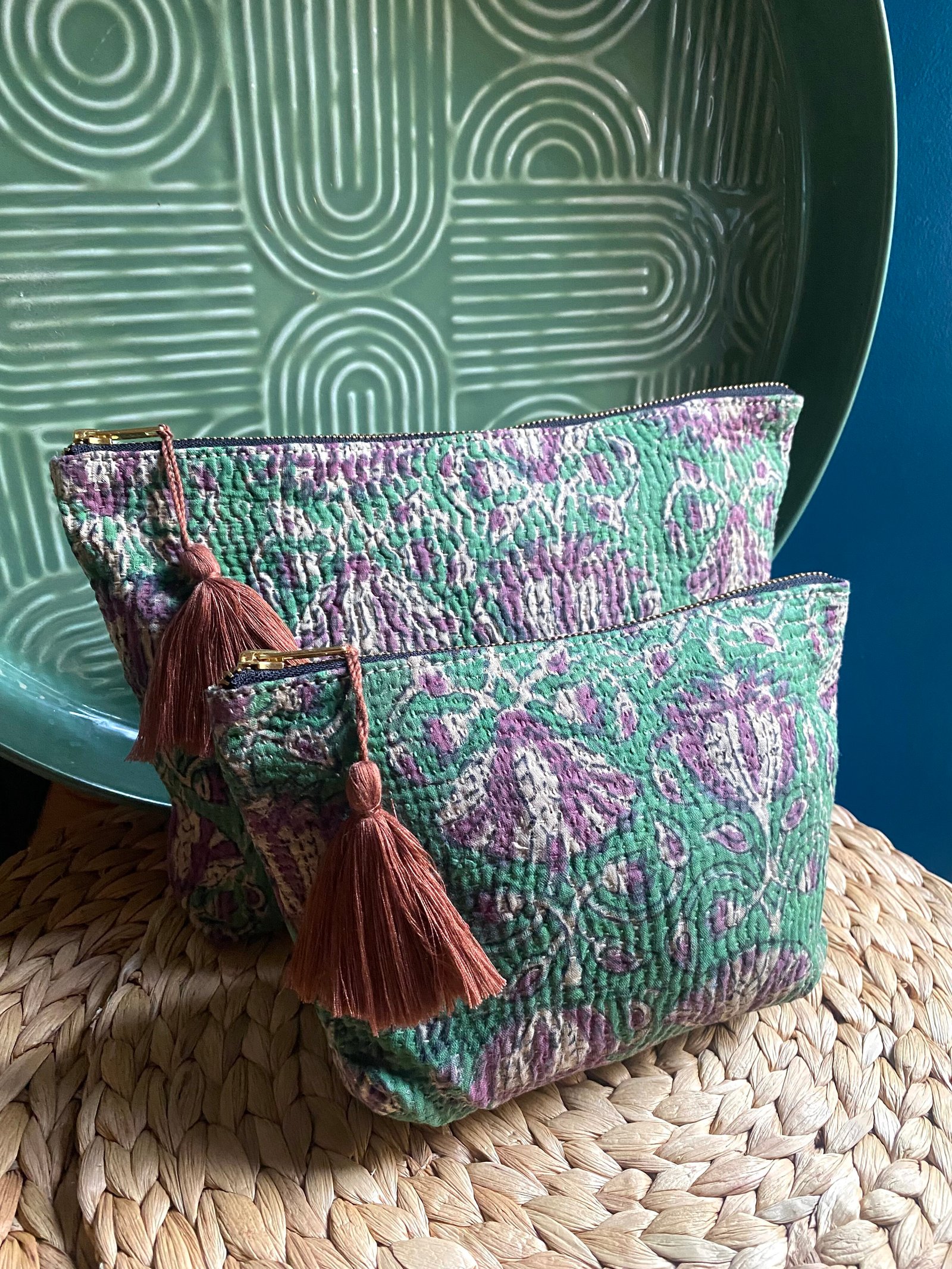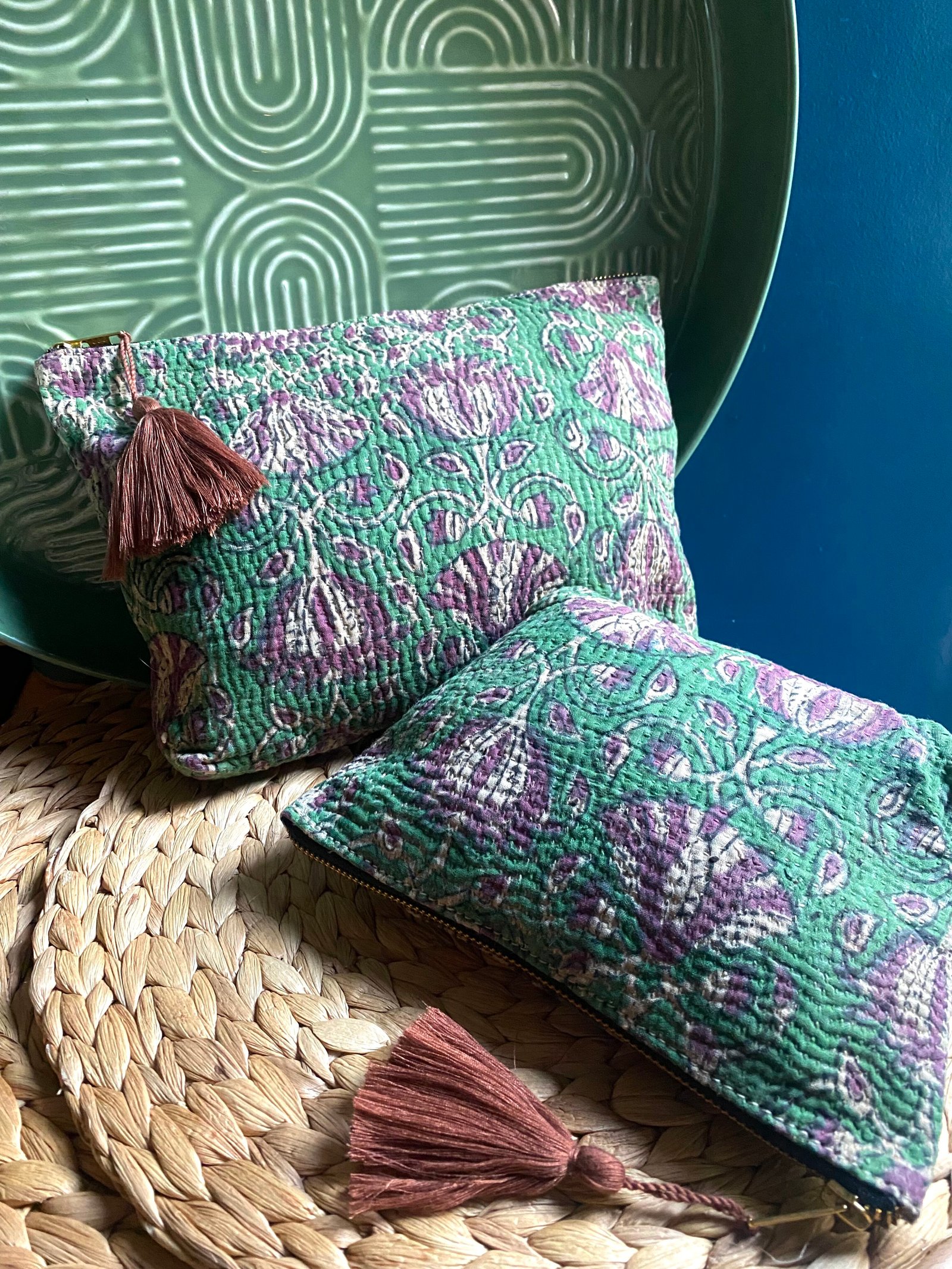 Ces pièces sont confectionnées à partir d’un kantha ancien. Elles peuvent présenter de légères irrégularités, traces d’usure ou variations de couleur, caractéristiques des textiles anciens cousus à la main. Ces marques sont volontairement conservées et font partie intégrante de l’âme et de l’unicité du produit.