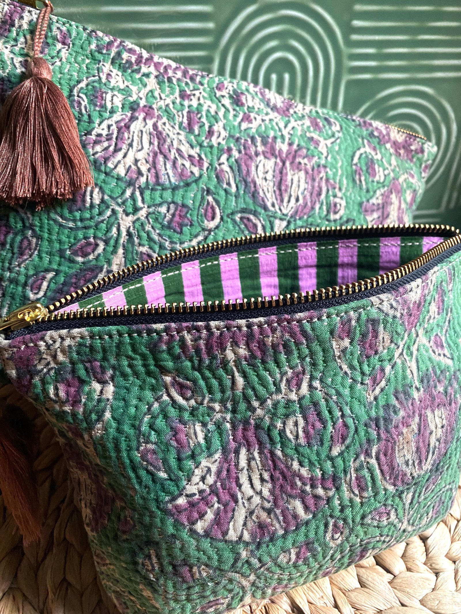 Ce set de trousses réalisé à partir des chutes des kanthas qui servent à la confection des vestes de la collection, vous rappelle que le monde est beau ! Fond plat très pratique. Doublure en coton imprimé. Pièce unique.