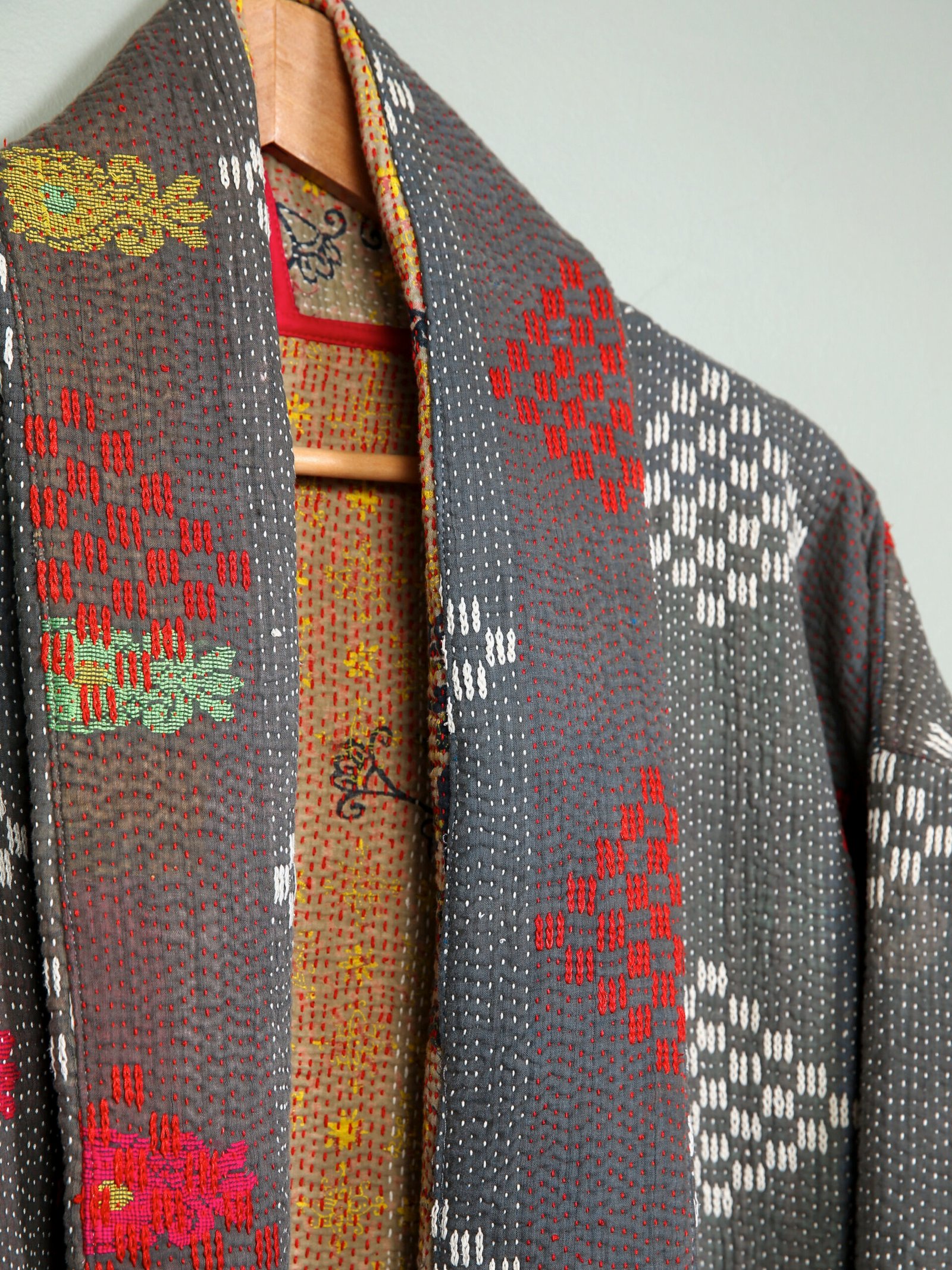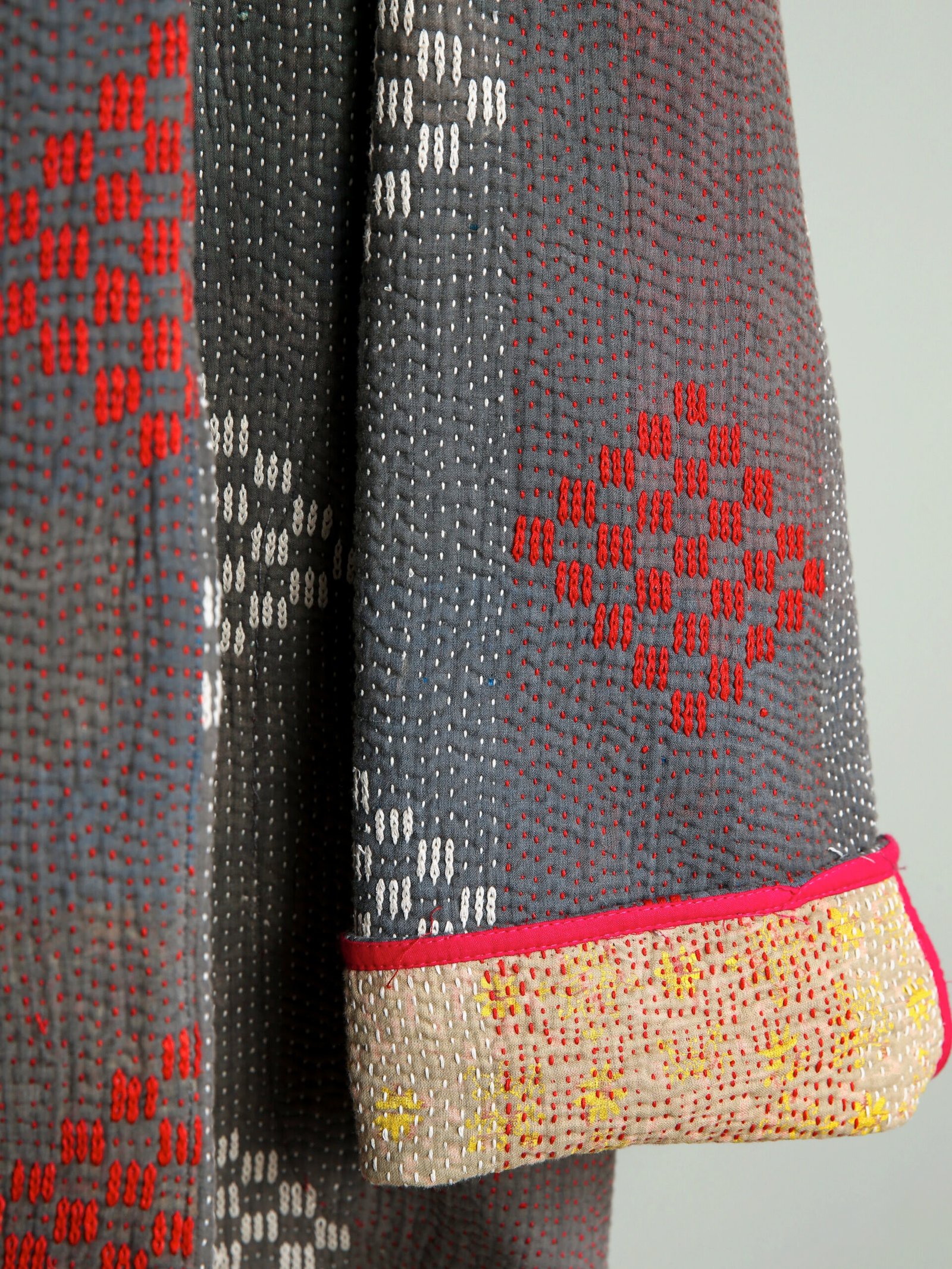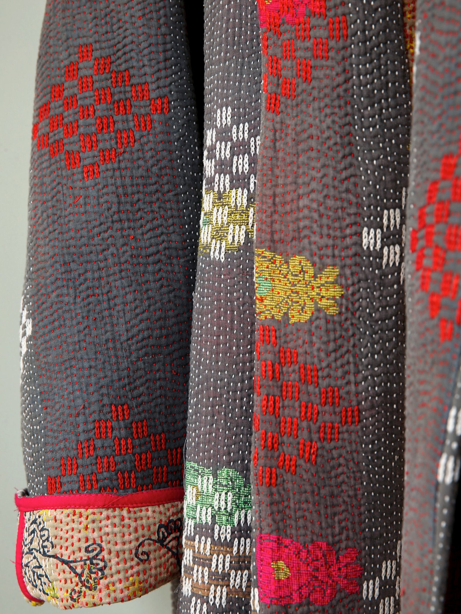 Les vestes de notre collection sont toutes des pièces unique créées à partir de tissus anciens appelés kanthas qui portent les empreintes du temps et des mains qui les ont façonné. De fait elle peuvent présenter quelques irrégularités sans pour autant en altérer la solidité. Chez Kahani Paris, nous considérons que ces irrégularités font l’âme et la beauté de nos produits.