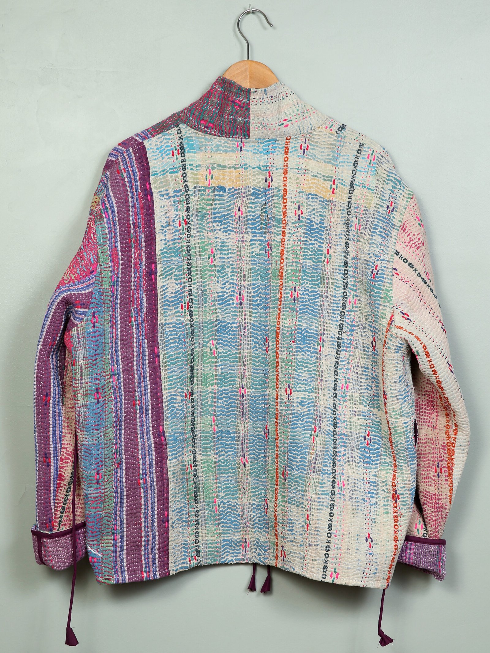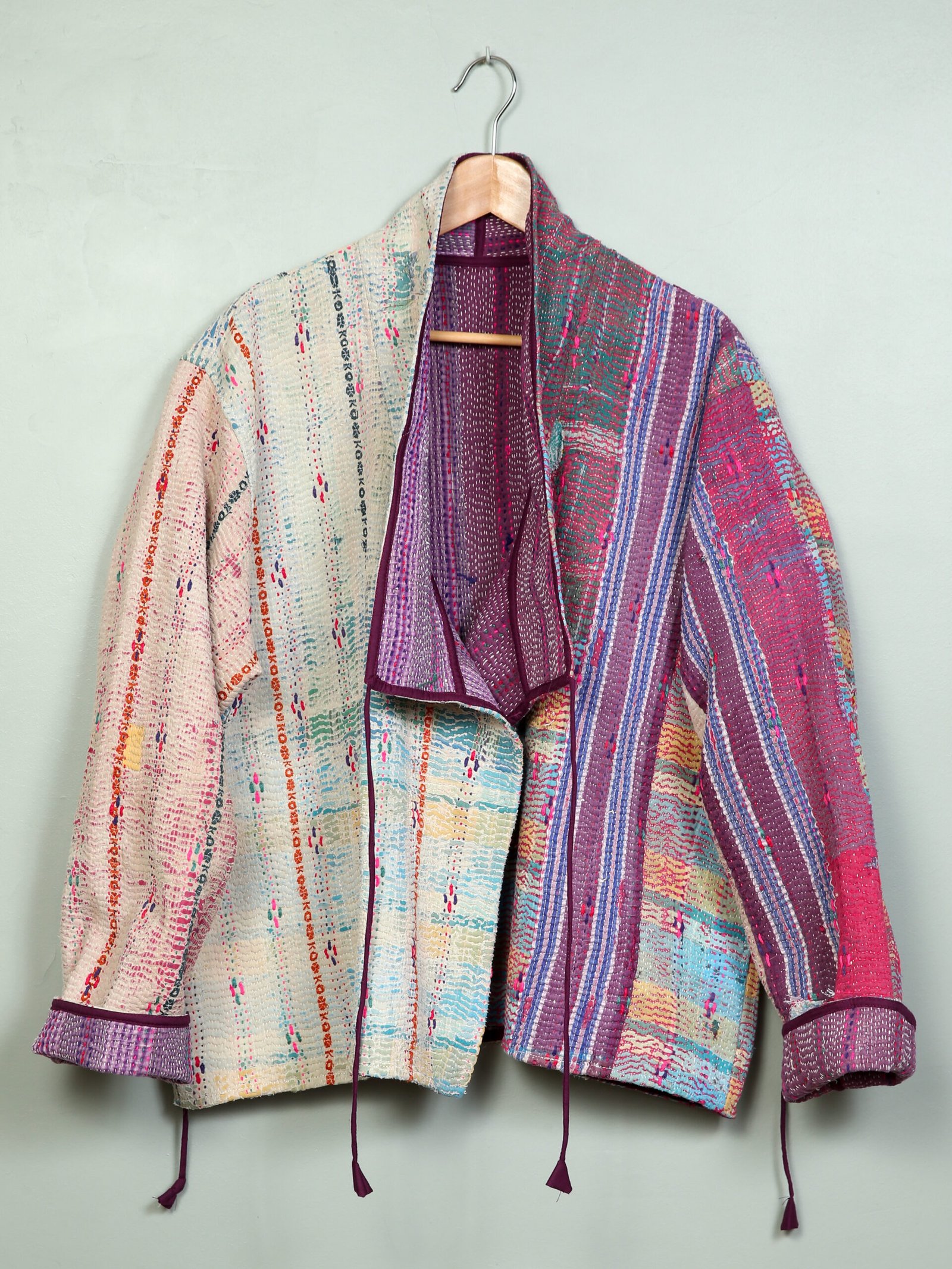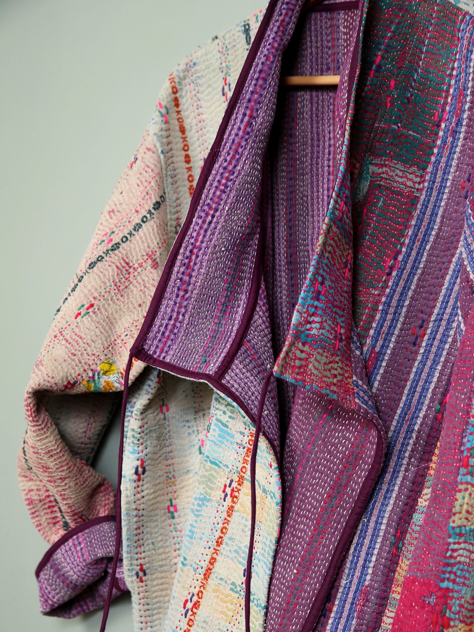 Cette veste est une pièce unique créée à partir d’un tissu ancien appelé kantha qui porte les empreintes du temps et des mains qui l’ont façonné. De fait elle peut présenter des irrégularités qui en font l’âme et la beauté.