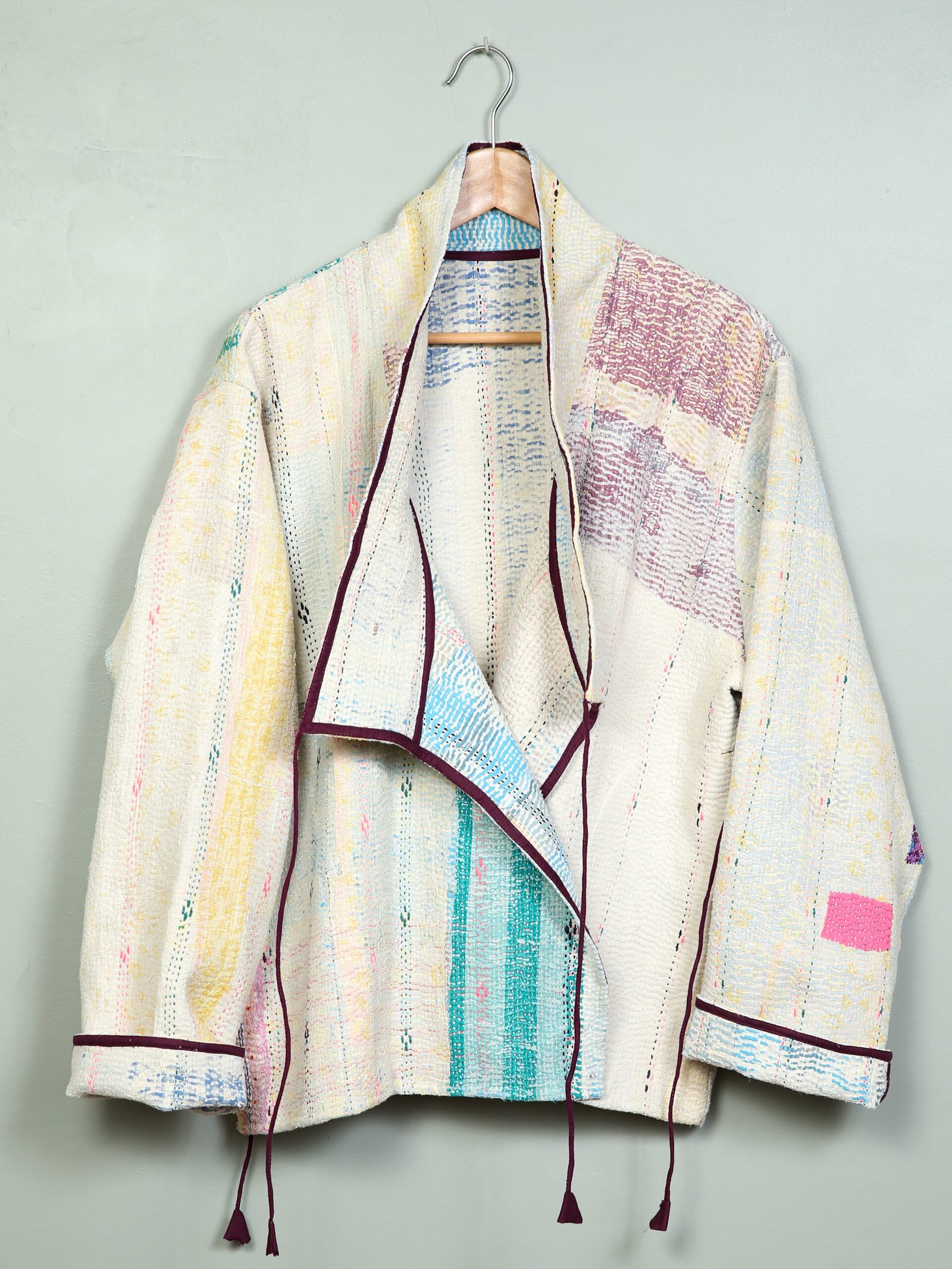 Cette veste est une pièce unique créée à partir d’un tissu ancien appelé kantha qui porte les empreintes du temps et des mains qui l’ont façonné. De fait elle peut présenter des irrégularités qui en font l’âme et la beauté.