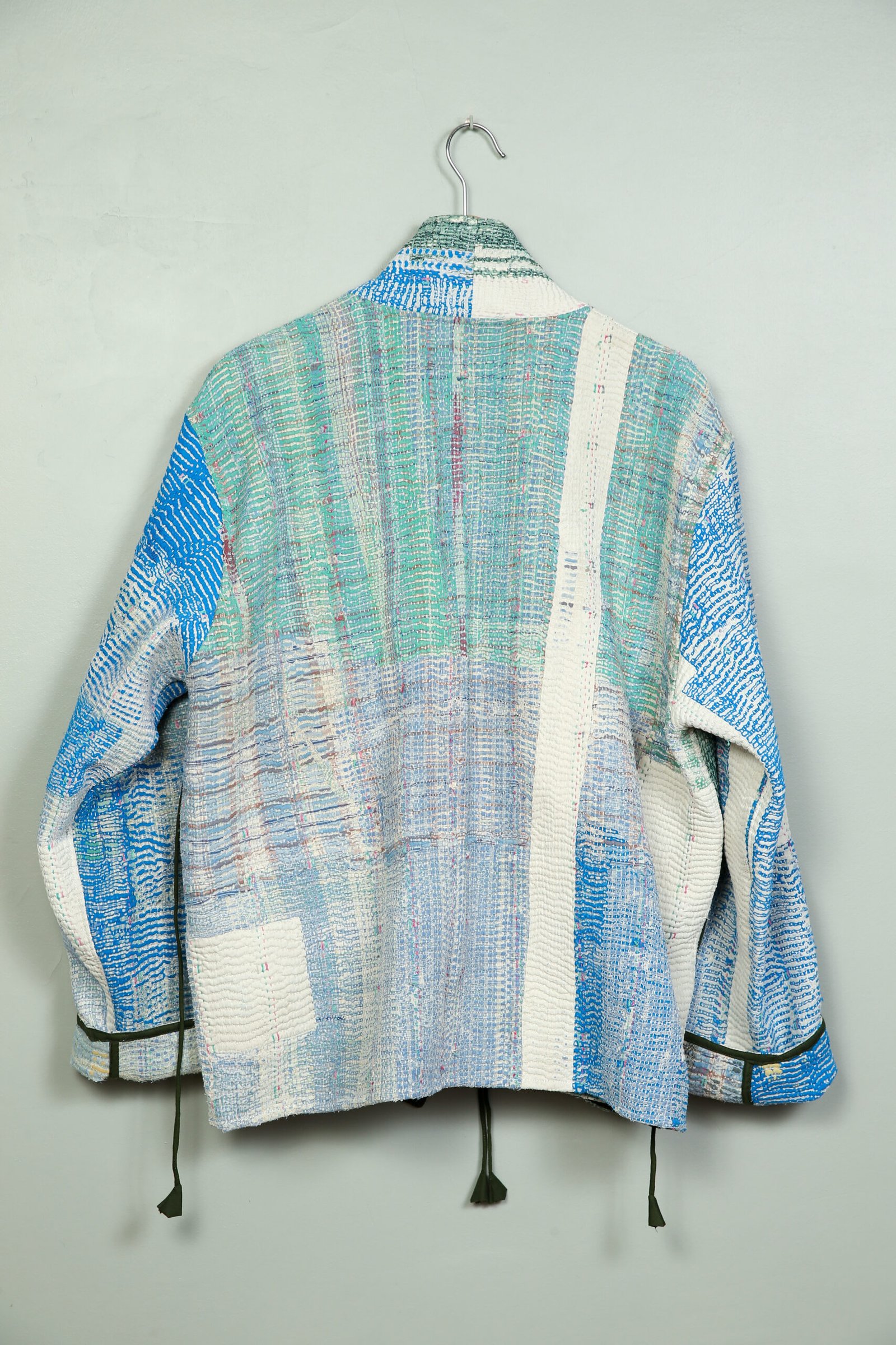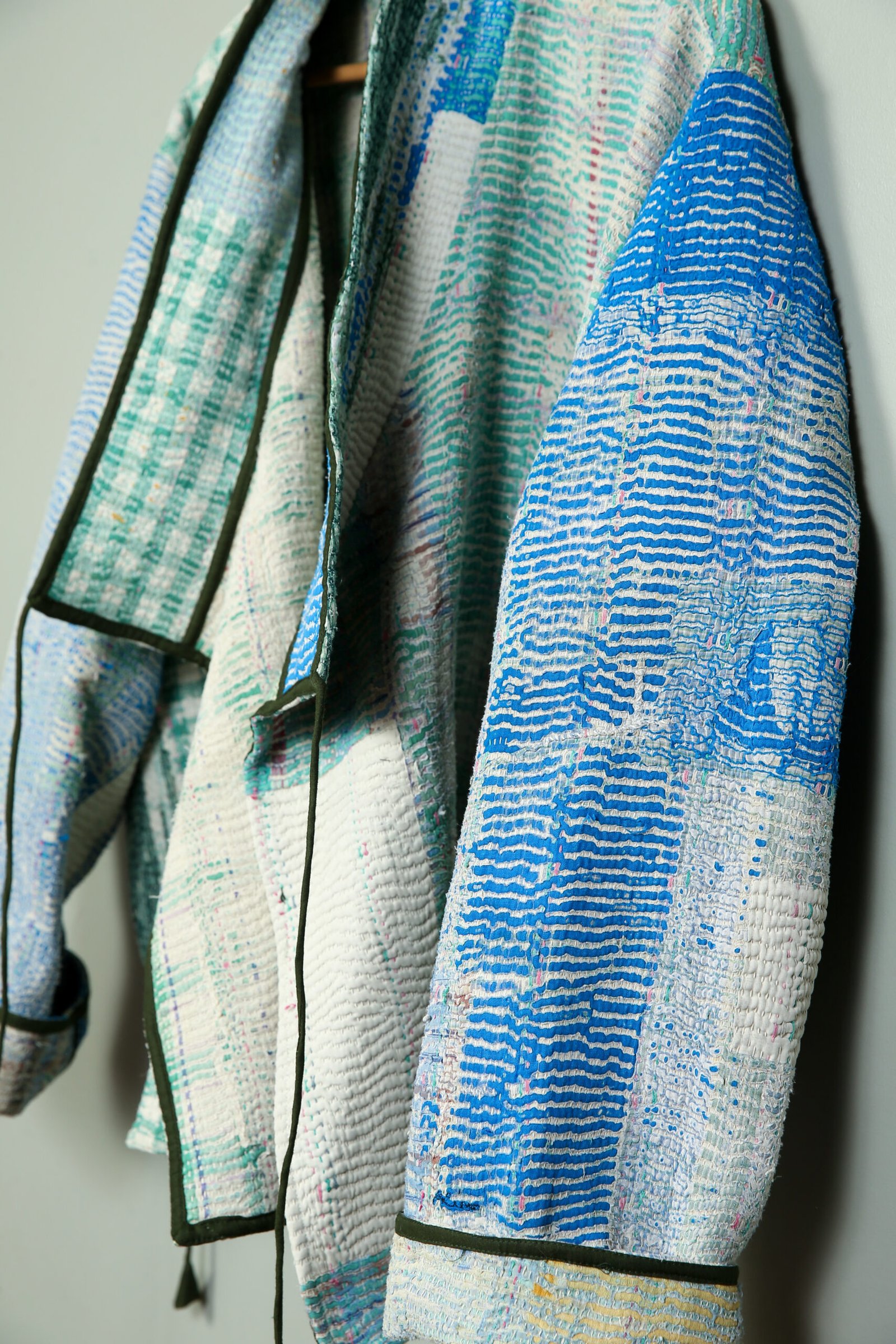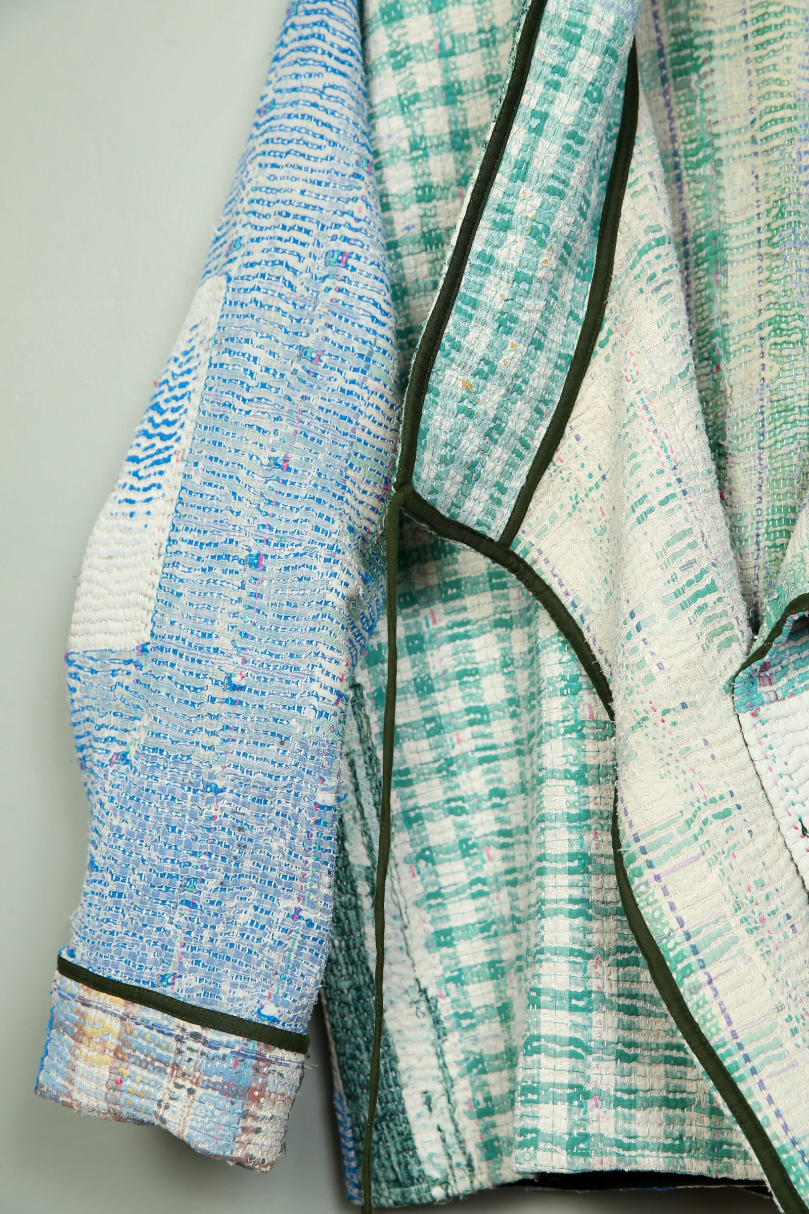 Cette veste est une pièce unique créée à partir d’un tissu ancien appelé kantha qui porte les empreintes du temps et des mains qui l’ont façonné. De fait elle peut présenter des irrégularités qui en font l’âme et la beauté.