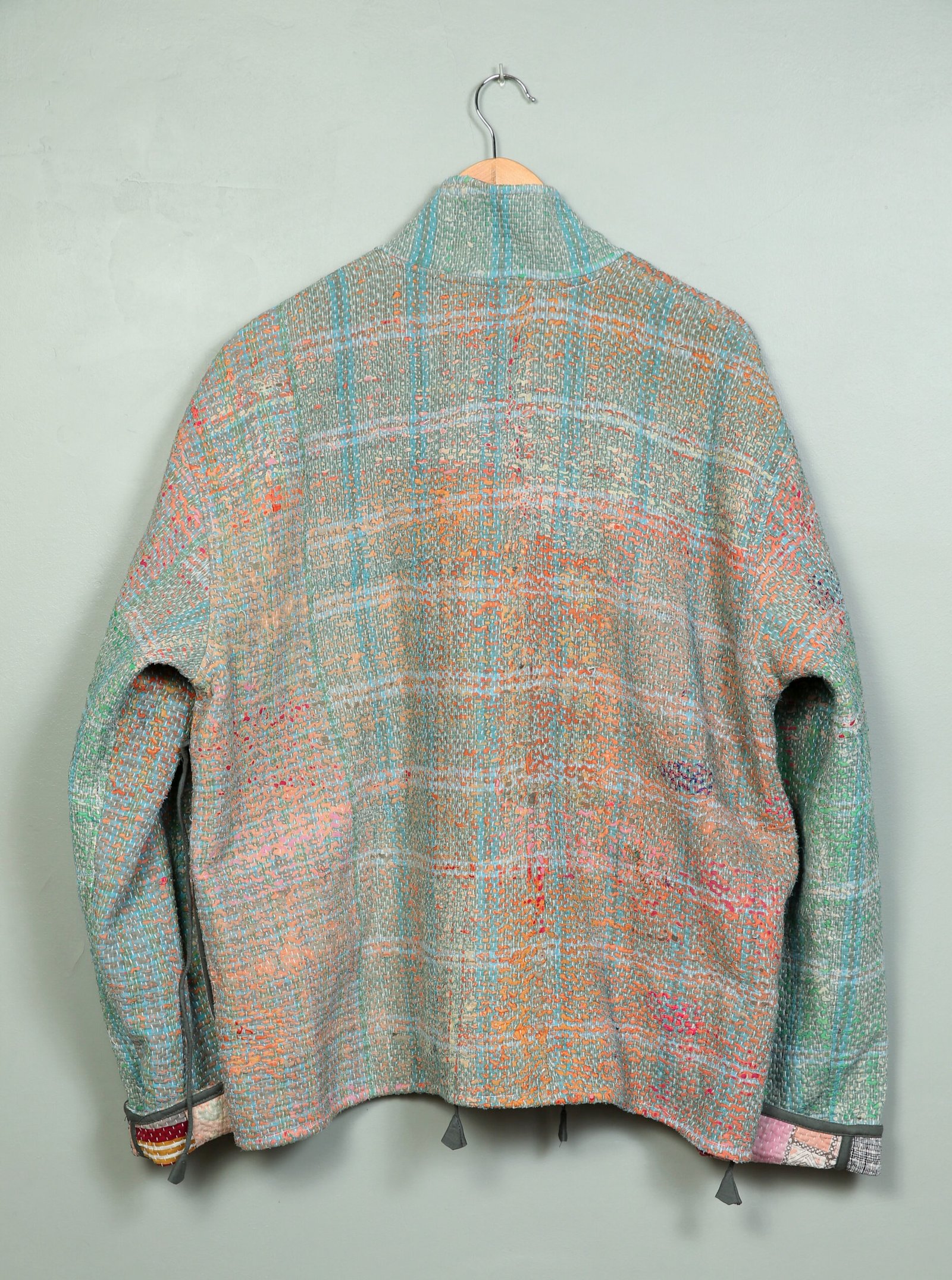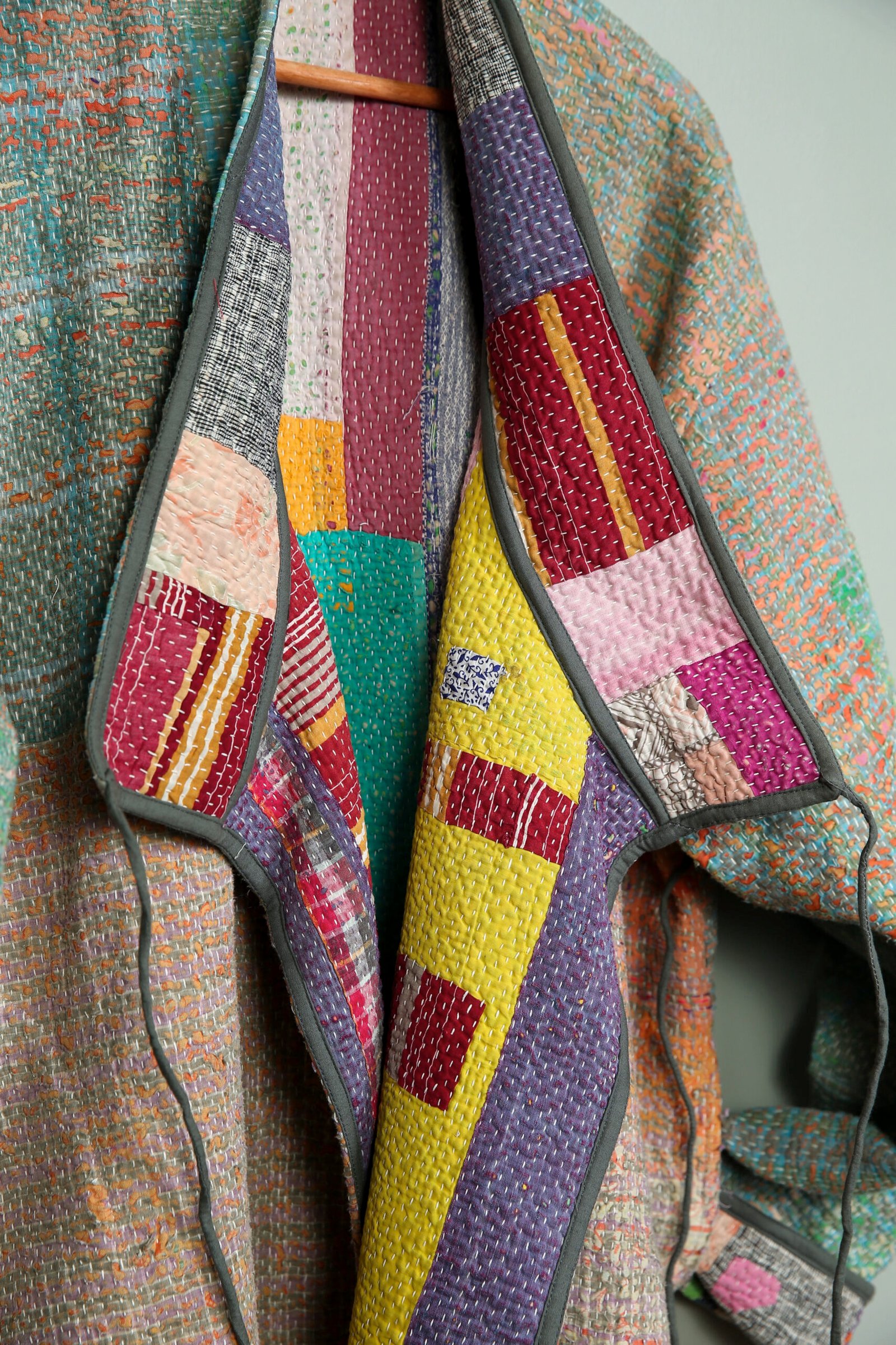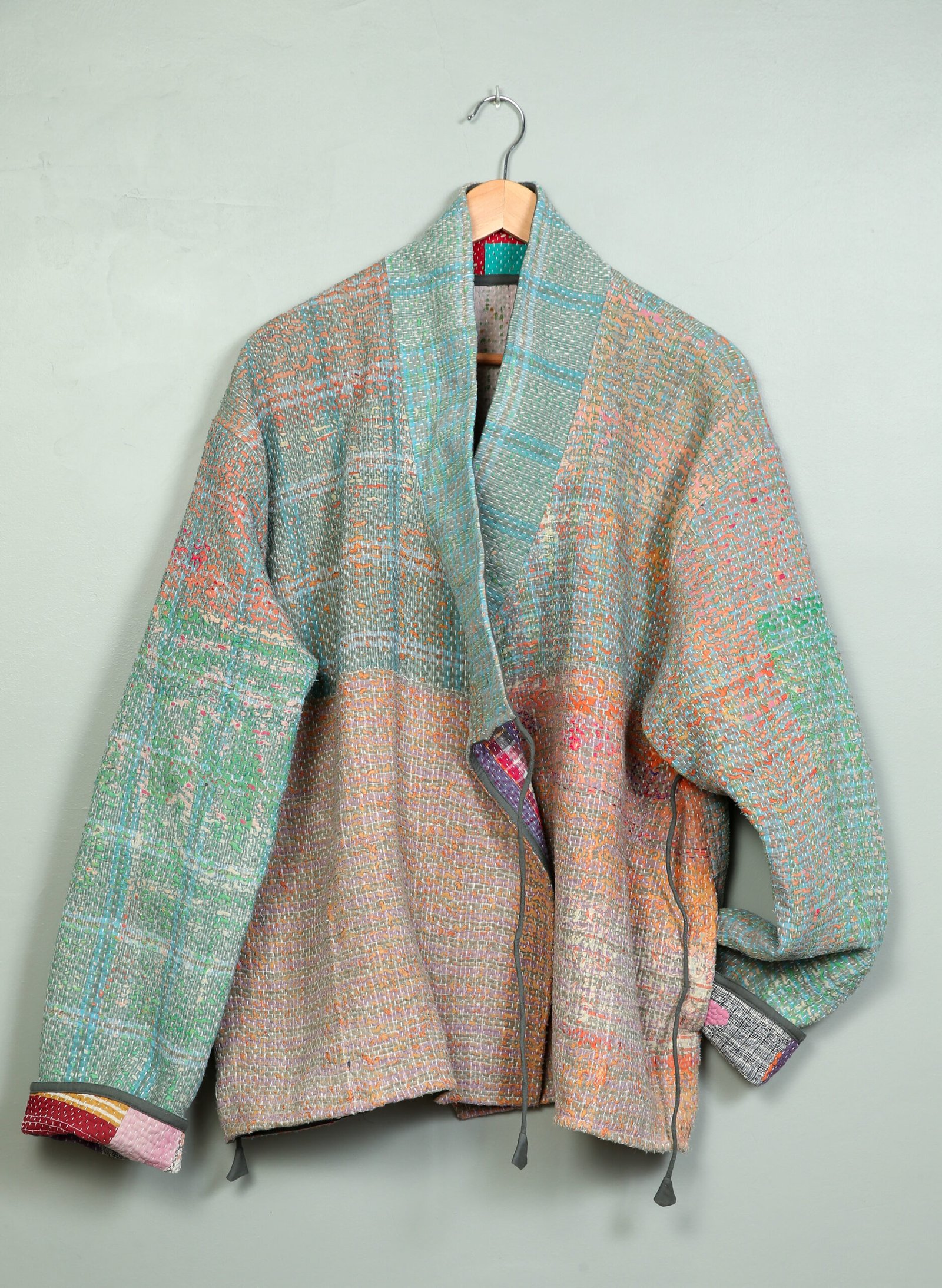Cette veste est une pièce unique créée à partir d’un tissu ancien appelé kantha qui porte les empreintes du temps et des mains qui l’ont façonné. De fait elle peut présenter des irrégularités qui en font l’âme et la beauté.