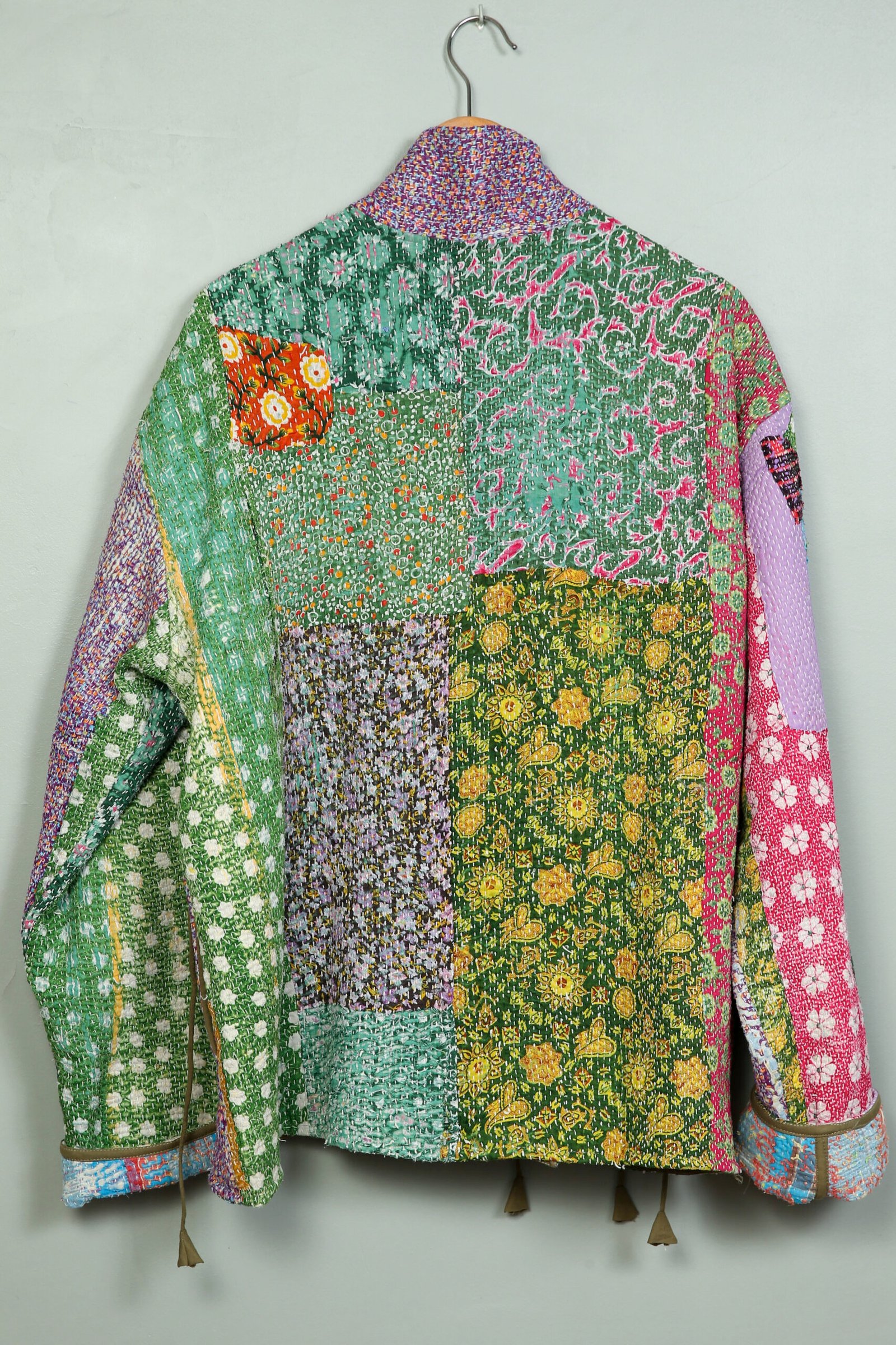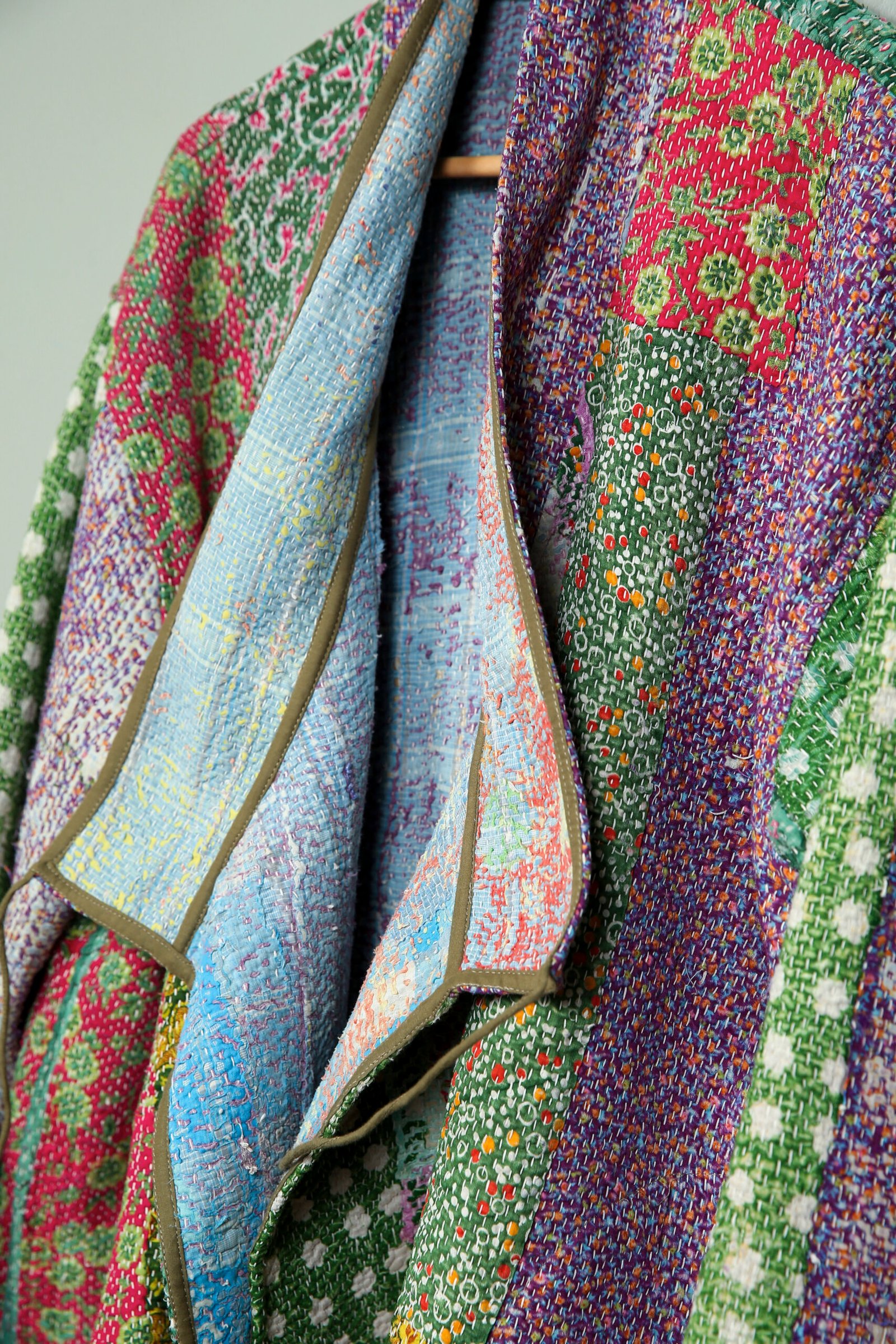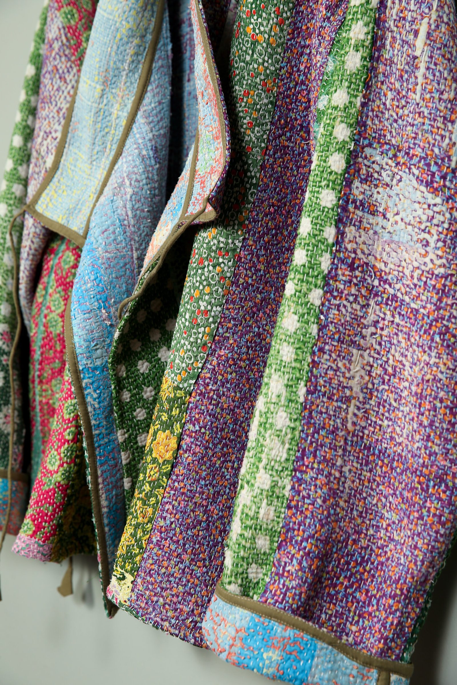 Cette veste est une pièce unique créée à partir d’un tissu ancien appelé kantha qui porte les empreintes du temps et des mains qui l’ont façonné. De fait elle peut présenter des irrégularités qui en font l’âme et la beauté.