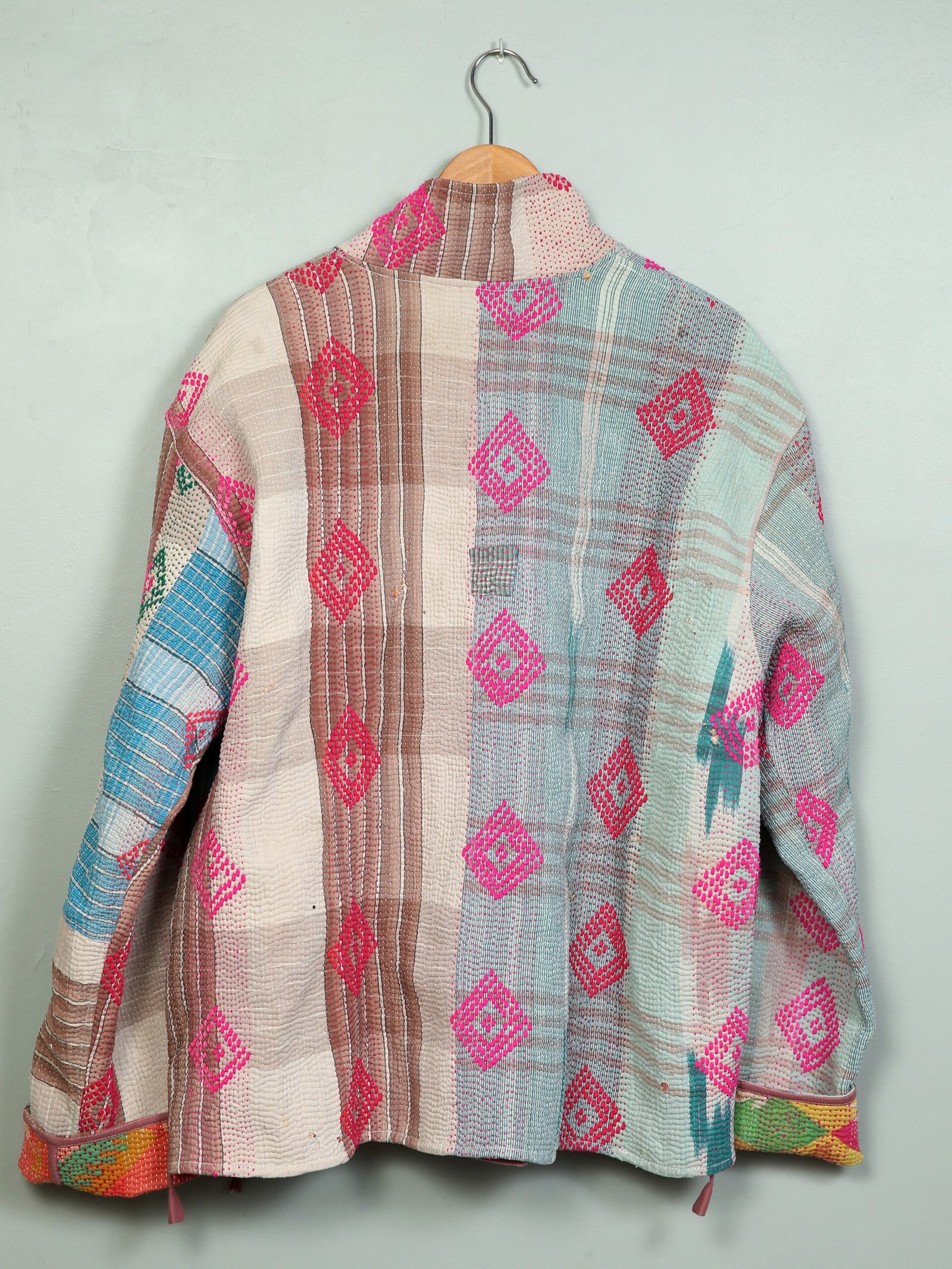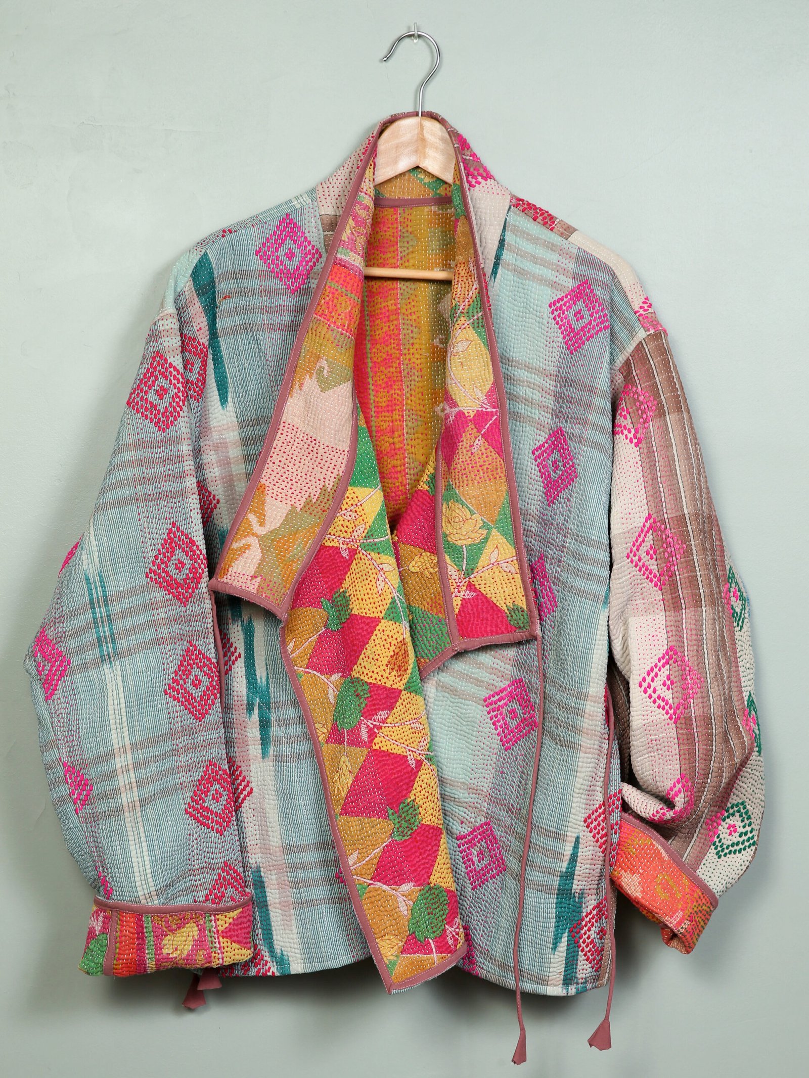 Cette veste est une pièce unique créée à partir d’un tissu ancien appelé kantha qui porte les empreintes du temps et des mains qui l’ont façonné. De fait elle peut présenter des irrégularités qui en font l’âme et la beauté.