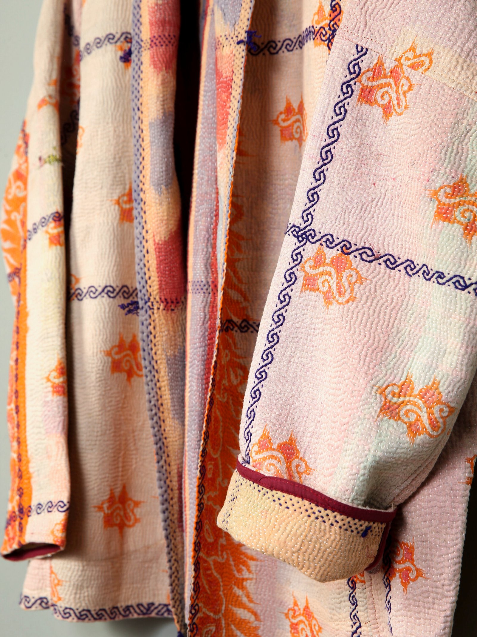 Cette pièce est confectionnée à partir d’un kantha ancien. Elle peut présenter de légères irrégularités, traces d’usure ou variations de couleur, caractéristiques des textiles anciens cousus à la main. Ces marques sont volontairement conservées et font partie intégrante de l’âme et de l’unicité du produit.