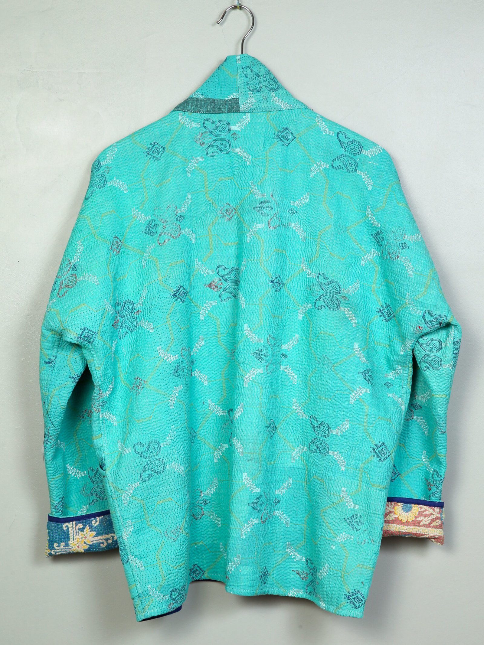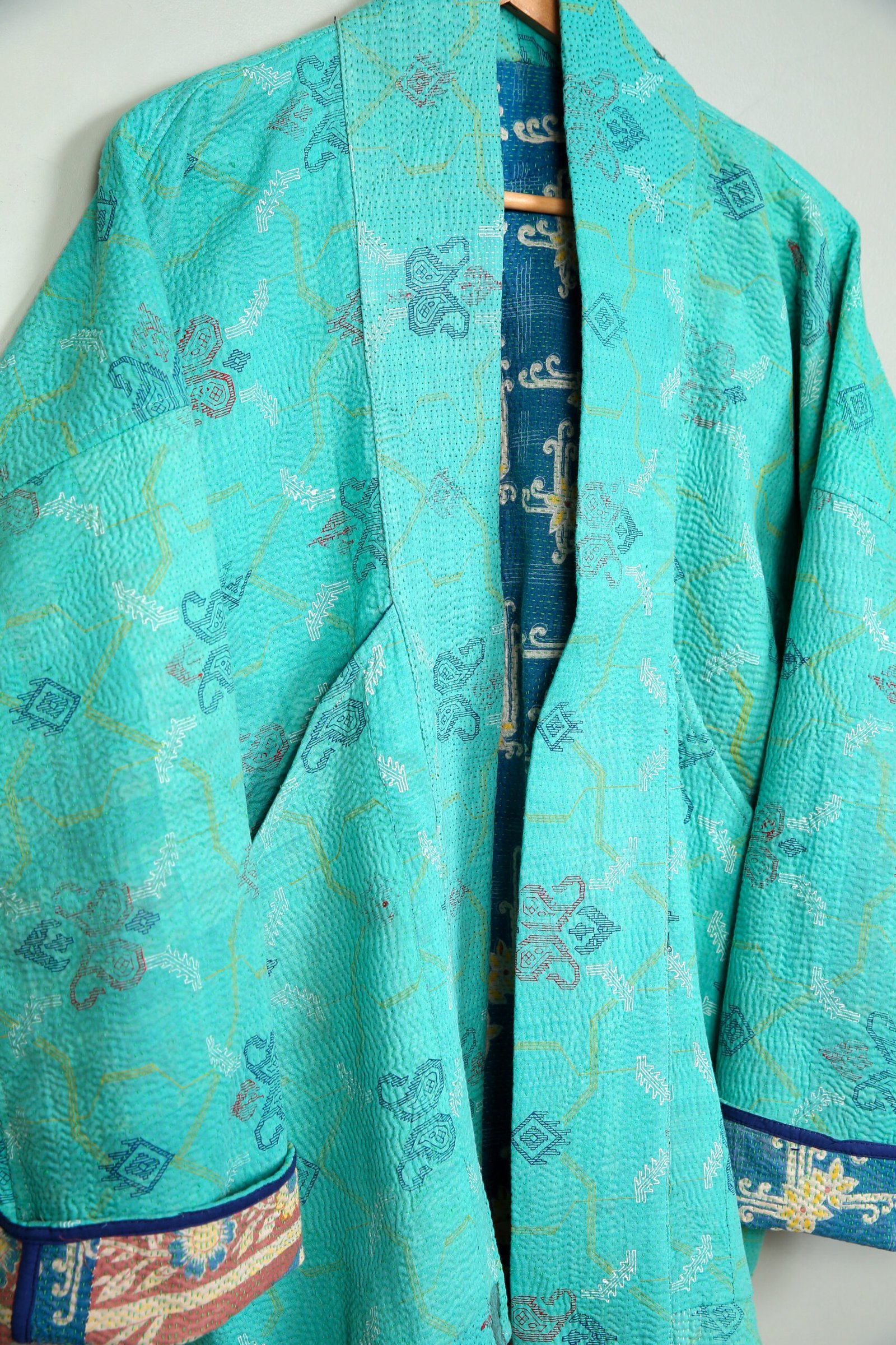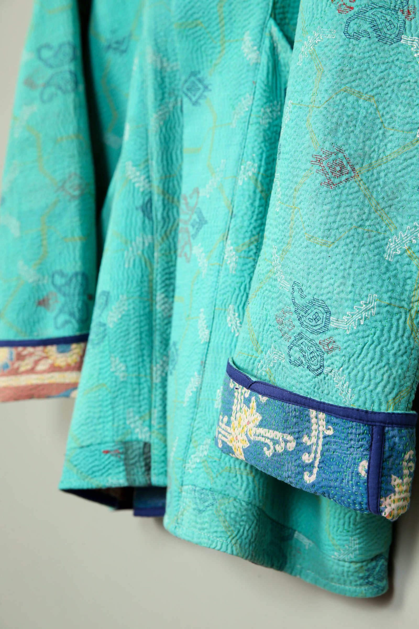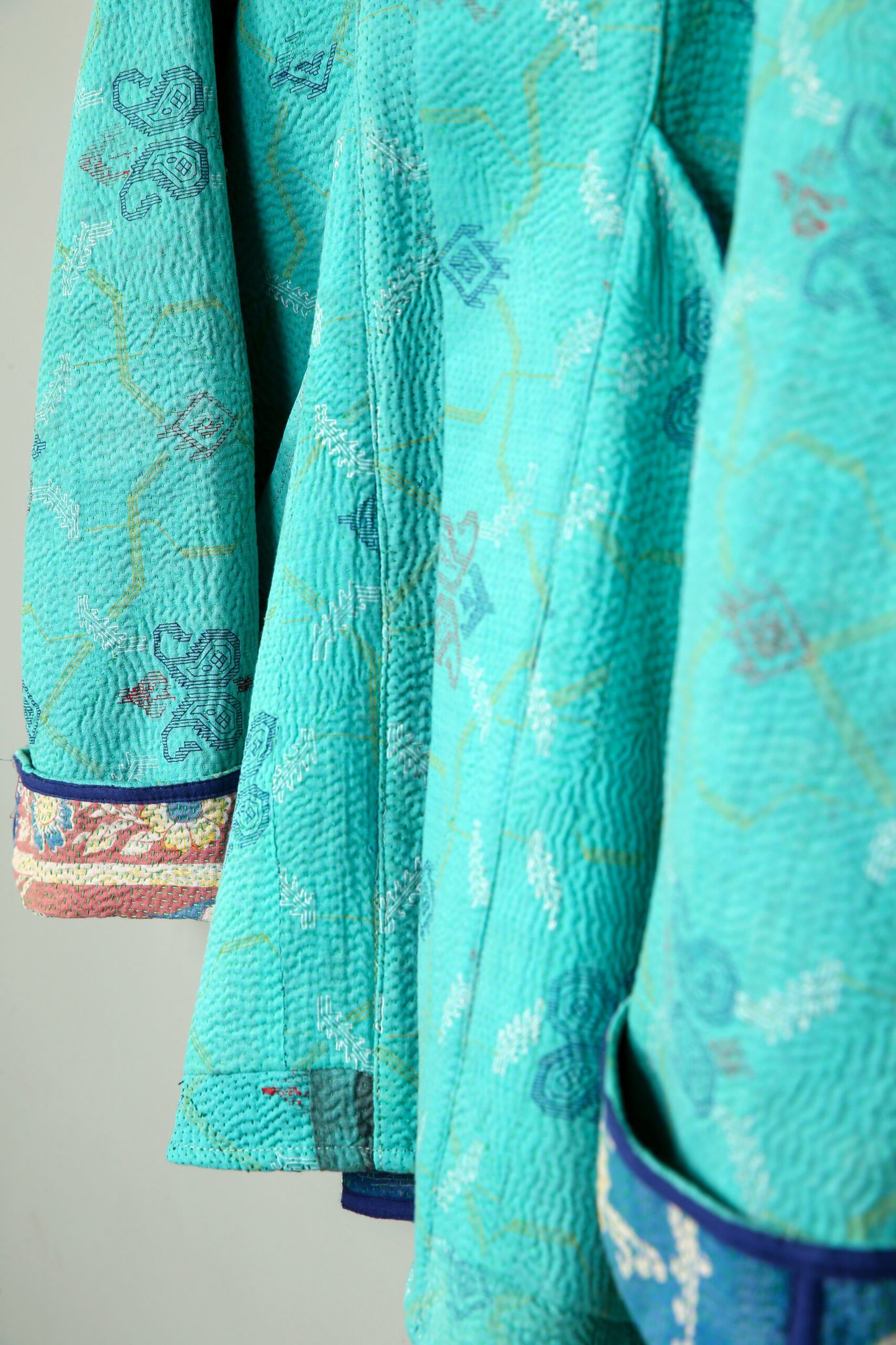 Cette veste est une pièce unique créée à partir d’un tissu ancien appelé kantha qui porte les empreintes du temps et des mains qui l’ont façonné. De fait elle peut présenter des irrégularités qui en font l’âme et la beauté sans en altérer la solidité.