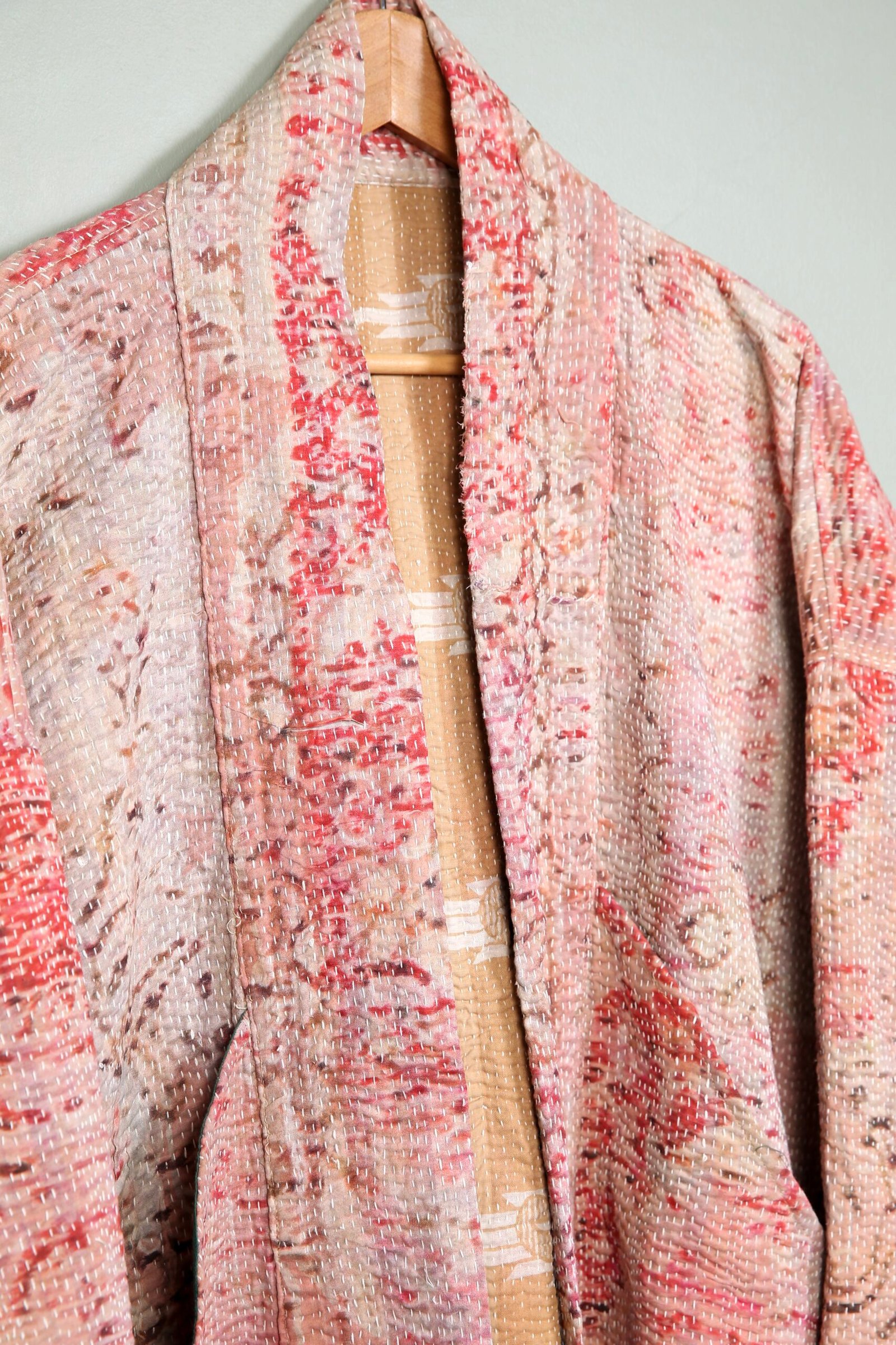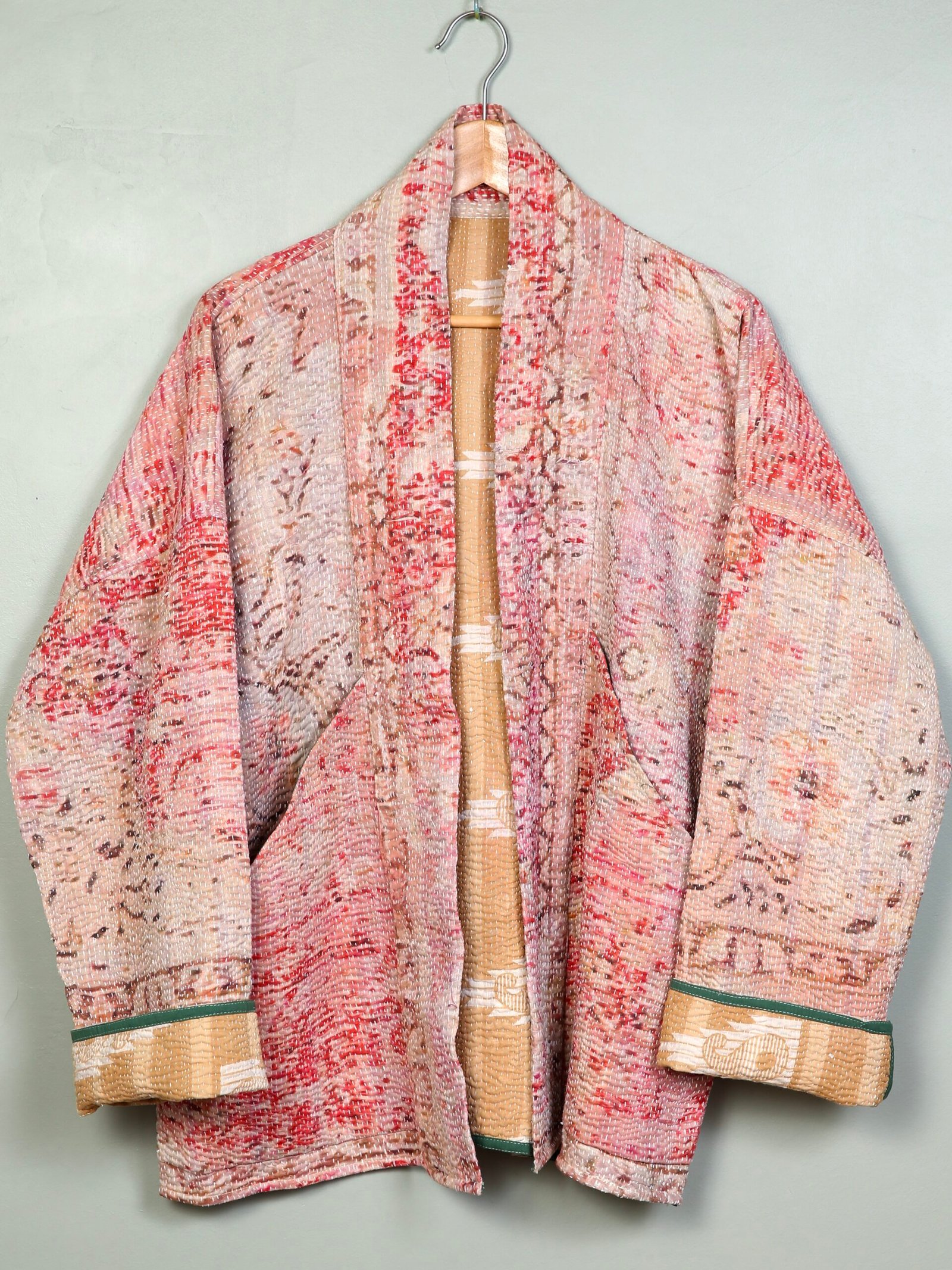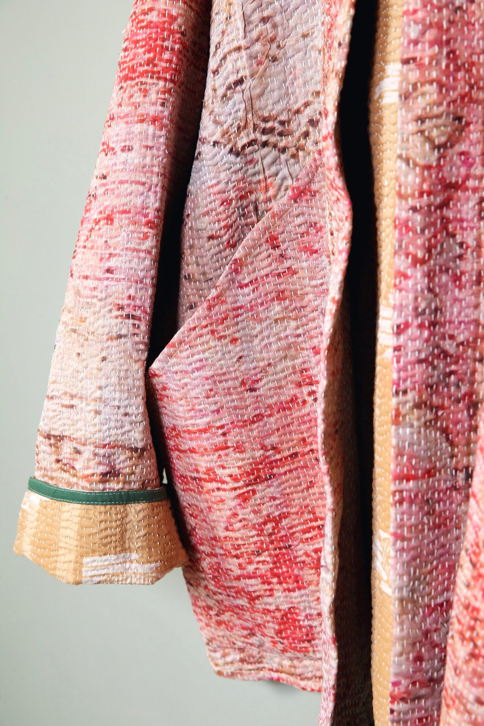 Cette veste est une pièce unique créée à partir d’un tissu ancien appelé kantha qui porte les empreintes du temps et des mains qui l’ont façonné. De fait elle peut présenter des irrégularités qui en font l’âme et la beauté.